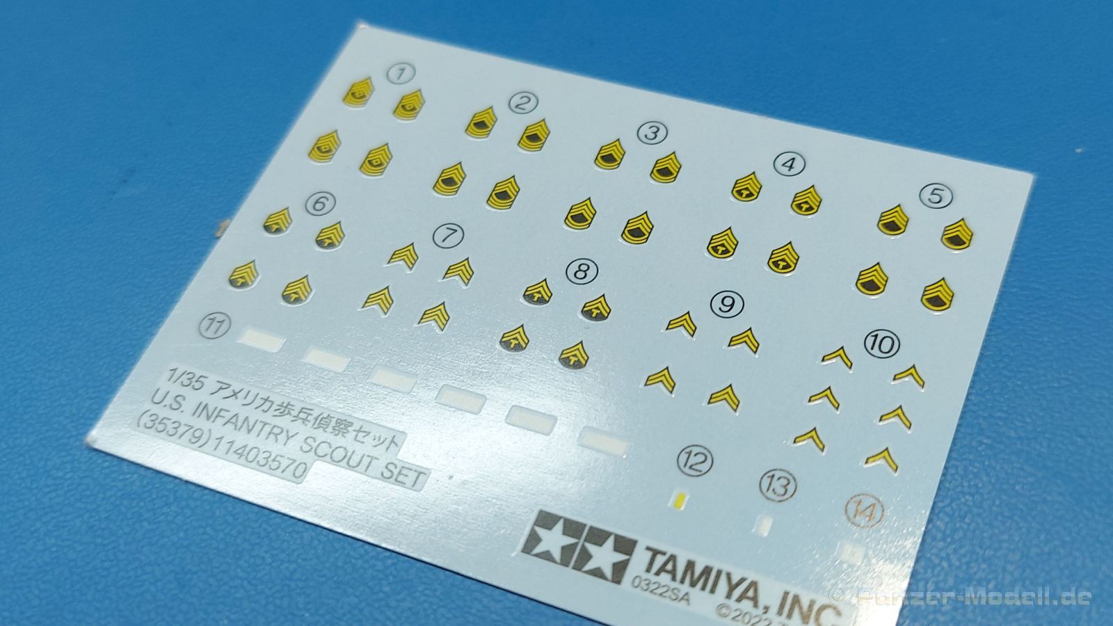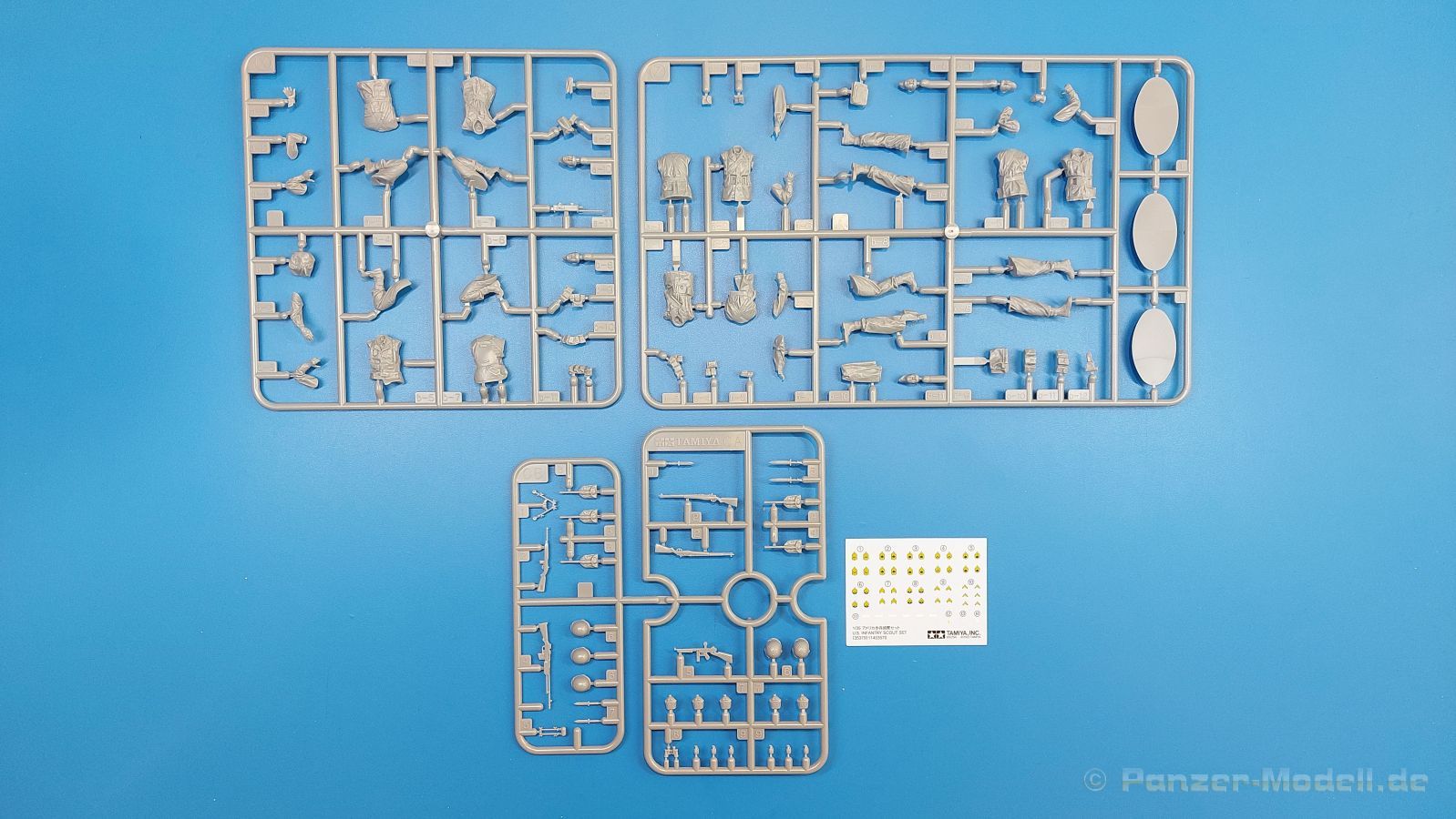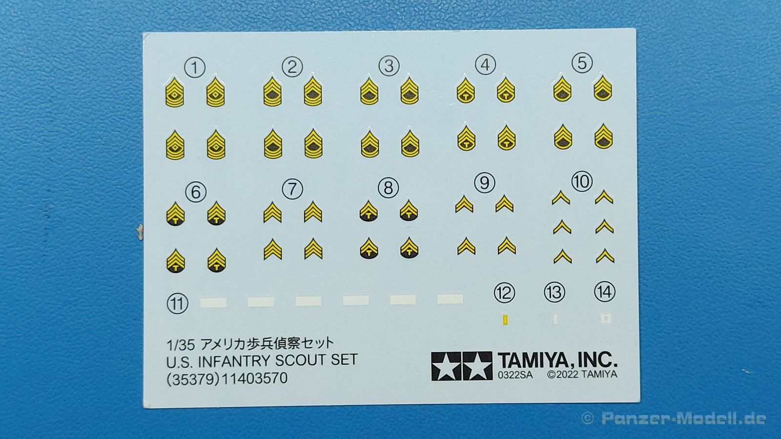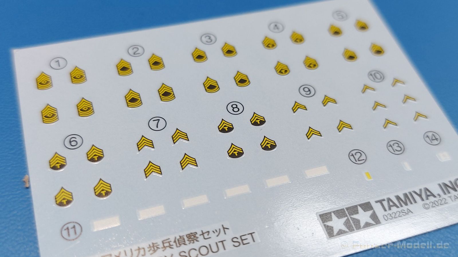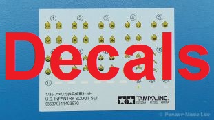 U.S. Infantry Scout Set Nach einer Weile kommt Tamiya mal wieder mit einem neuen Figurensatz. Es handelt sich um einen U.S. Aufklärungstrupp in Uniformen, wie sie ab der zweiten Jahreshälfte des Jahres 1944 üblich wurden. In einem 260 x 160 x 40 mm großen Stülpdeckelkarton mit dem Tamiya-typischen Kartonbild finden sich zwei mittelgraue Spritzlinge mit den Figuren, zwei weitere mit Waffen und Ausrüstung, ein Decalblatt und die Bauanleitung. An den Seitenrändern des Kartons sieht man, farbig dargestellt, Waffen und Ausrüstungsgegenstände, sowie deren Bezeichnung in Englisch und Japanisch. Die Spritzlinge sind sauber ausgegossen, ohne Versatz, Fischhäute oder Grat. Angüsse sind auf das notwendige Minimum reduziert. Details wie Faltenwurf und Gesichter sind gut definiert. Tamiya eben! Alle Figuren bestehen aus Kopf, zweiteiligem Rumpf, Armen und Beinen, teils auch mit separaten Händen. Das Koppelzeug ist bereits an den Rümpfen angegossen, für die Ausrüstungsgegenstände gibt es deutlich erkennbare Ansatzpunkte, damit sie sich natürlich an die Körper anschmiegen. Die Köpfe sind schön gestaltet mit guten Gesichtern. Die Doppelschnallenstiefel mit den Ledergamaschen sind echte Hingucker. Für die drei stehenden Figuren gibt es Basisplatten, falls man sie sich so in die Vitrine stellen möchte. Noch nicht so scharf detailliert wie Resin-Figuren, aber nicht sehr weit entfernt. Für Plastik absolut erste Klasse! Das Set stellt einen Aufklärungstrupp beim Orientierungshalt dar. Die Haltungen sind entspannt und man wartet darauf, bis der Funker seinen Spruch abgesetzt hat. Der Truppführer und zwei Soldaten stehen, der Funker und ein weiterer Soldat knien. Die Grundausstattung der Soldaten besteht aus Feldflasche, Bajonett, bzw. Kampfmesser, Klappspaten in Koppeltasche, Stahlhelm und der Waffe entsprechende Munitionstaschen. Bei allen Stahlhelmen ist der Kinnriemen über den vorderen Rand geschoben. Zwei Helme sind aufgegossenem Tarnnetz versehen. Wahlweise gibt es noch 6 Eierhandgranaten, die man nach Belieben anbringen kann. Trageriemen für die Waffen und das Fernglas muss man selbst herstellen, sofern man sie anbringen möchte.