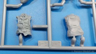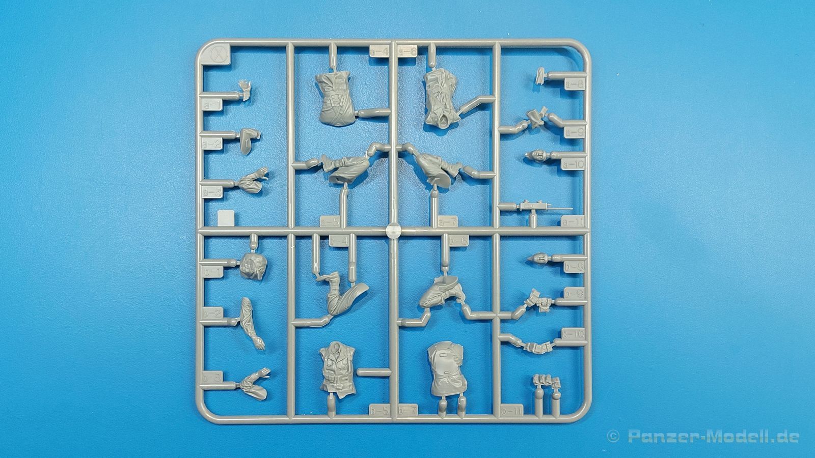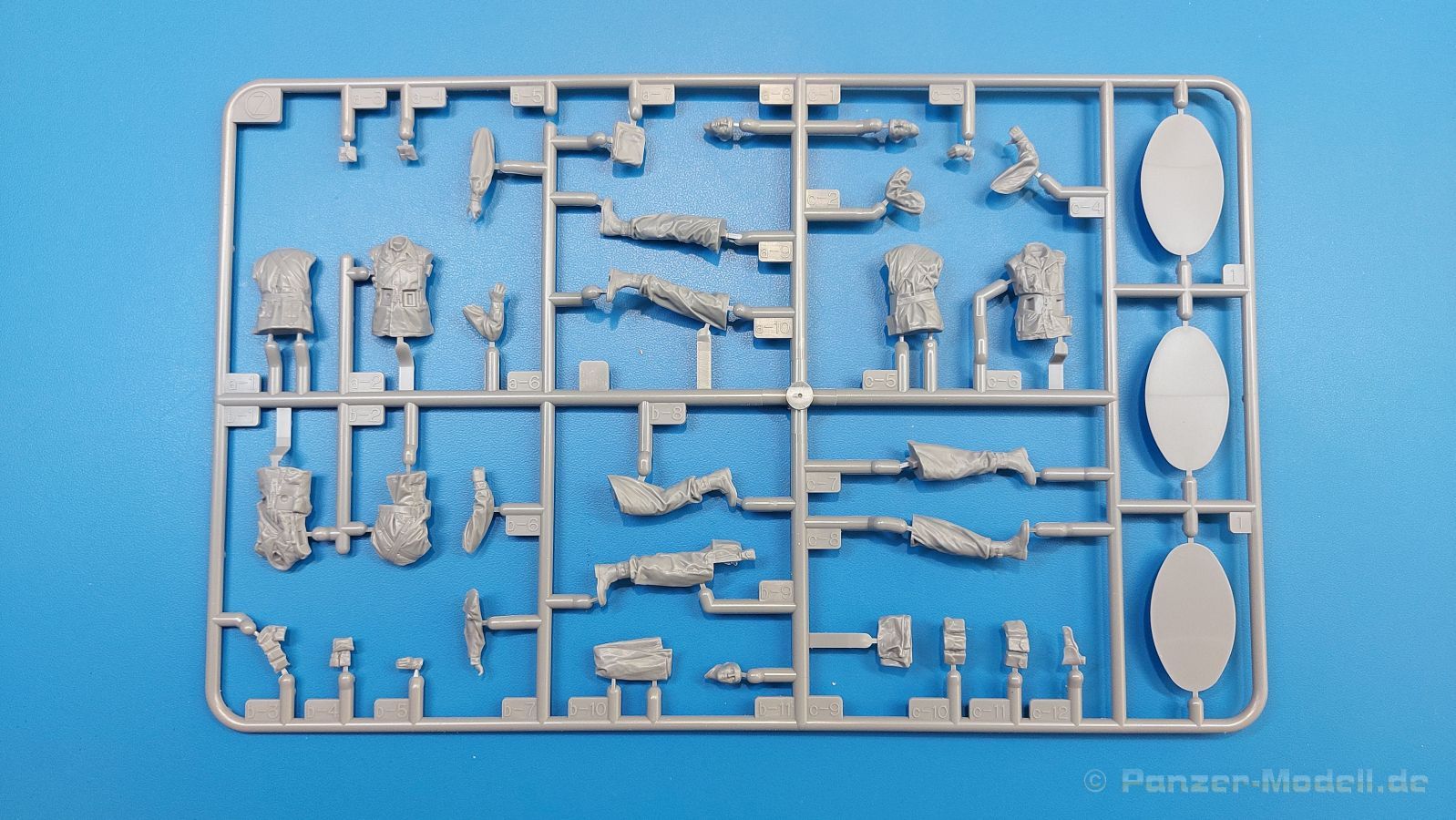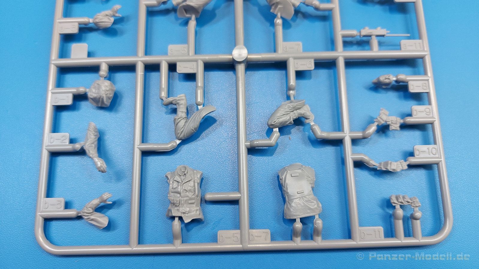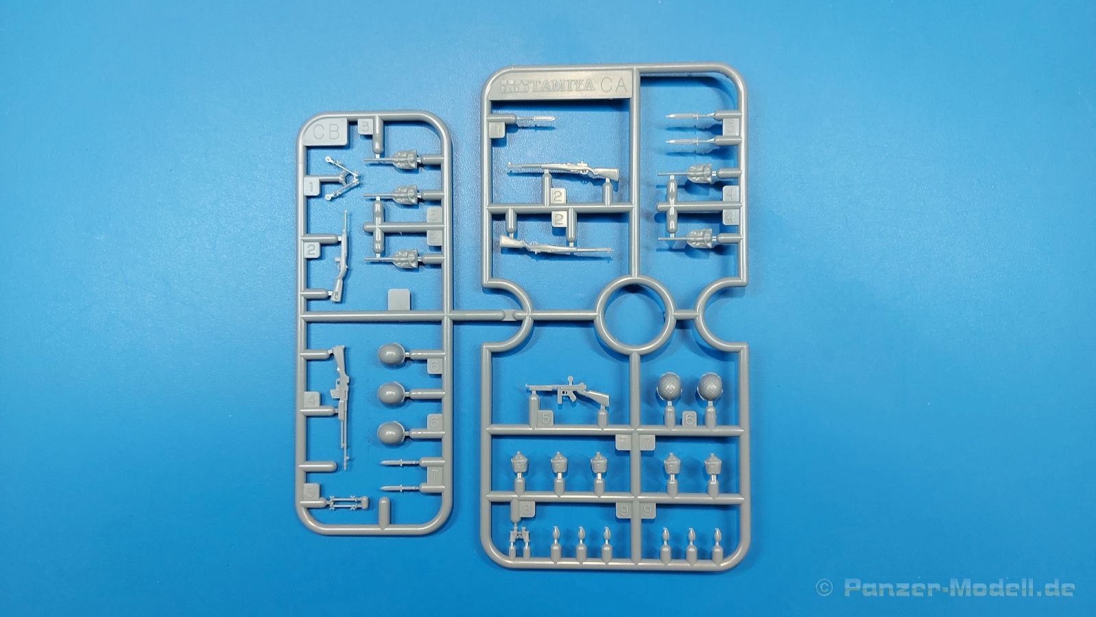 U.S. Infantry Scout Set Nach einer Weile kommt Tamiya mal wieder mit einem neuen Figurensatz. Es handelt sich um einen U.S. Aufklärungstrupp in Uniformen, wie sie ab der zweiten Jahreshälfte des Jahres 1944 üblich wurden. In einem 260 x 160 x 40 mm großen Stülpdeckelkarton mit dem Tamiya-typischen Kartonbild finden sich zwei mittelgraue Spritzlinge mit den Figuren, zwei weitere mit Waffen und Ausrüstung, ein Decalblatt und die Bauanleitung. An den Seitenrändern des Kartons sieht man, farbig dargestellt, Waffen und Ausrüstungsgegenstände, sowie deren Bezeichnung in Englisch und Japanisch. Die Spritzlinge sind sauber ausgegossen, ohne Versatz, Fischhäute oder Grat. Angüsse sind auf das notwendige Minimum reduziert. Details wie Faltenwurf und Gesichter sind gut definiert. Tamiya eben! Alle Figuren bestehen aus Kopf, zweiteiligem Rumpf, Armen und Beinen, teils auch mit separaten Händen. Das Koppelzeug ist bereits an den Rümpfen angegossen, für die Ausrüstungsgegenstände gibt es deutlich erkennbare Ansatzpunkte, damit sie sich natürlich an die Körper anschmiegen. Die Köpfe sind schön gestaltet mit guten Gesichtern. Die Doppelschnallenstiefel mit den Ledergamaschen sind echte Hingucker. Für die drei stehenden Figuren gibt es Basisplatten, falls man sie sich so in die Vitrine stellen möchte. Noch nicht so scharf detailliert wie Resin-Figuren, aber nicht sehr weit entfernt. Für Plastik absolut erste Klasse! Das Set stellt einen Aufklärungstrupp beim Orientierungshalt dar. Die Haltungen sind entspannt und man wartet darauf, bis der Funker seinen Spruch abgesetzt hat. Der Truppführer und zwei Soldaten stehen, der Funker und ein weiterer Soldat knien. Die Grundausstattung der Soldaten besteht aus Feldflasche, Bajonett, bzw. Kampfmesser, Klappspaten in Koppeltasche, Stahlhelm und der Waffe entsprechende Munitionstaschen. Bei allen Stahlhelmen ist der Kinnriemen über den vorderen Rand geschoben. Zwei Helme sind aufgegossenem Tarnnetz versehen. Wahlweise gibt es noch 6 Eierhandgranaten, die man nach Belieben anbringen kann. Trageriemen für die Waffen und das Fernglas muss man selbst herstellen, sofern man sie anbringen möchte.