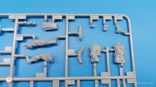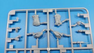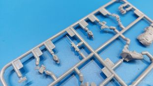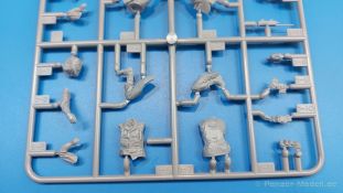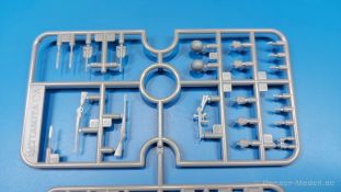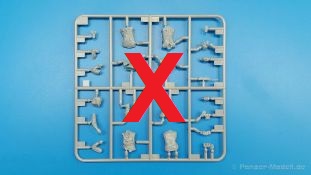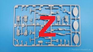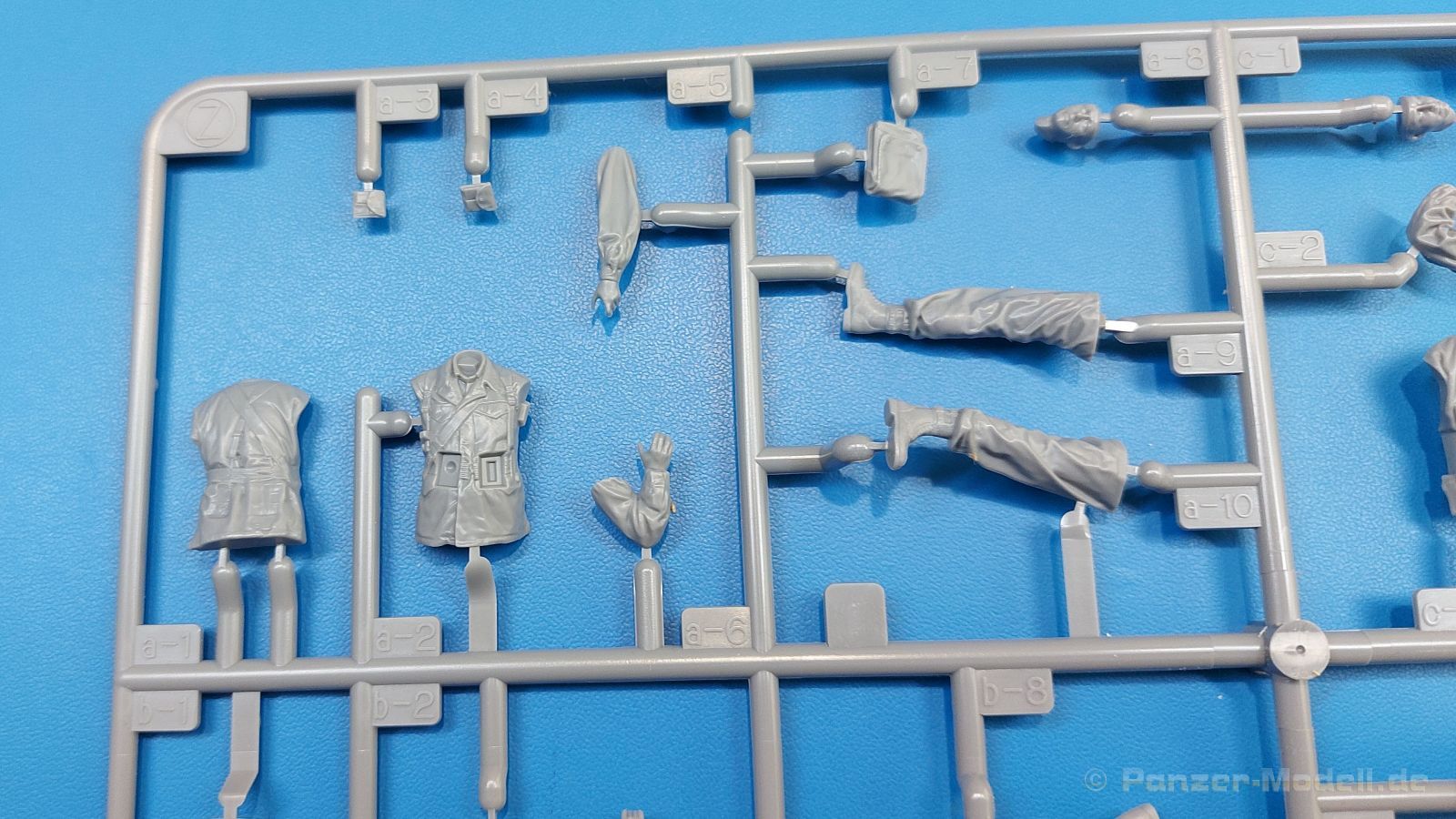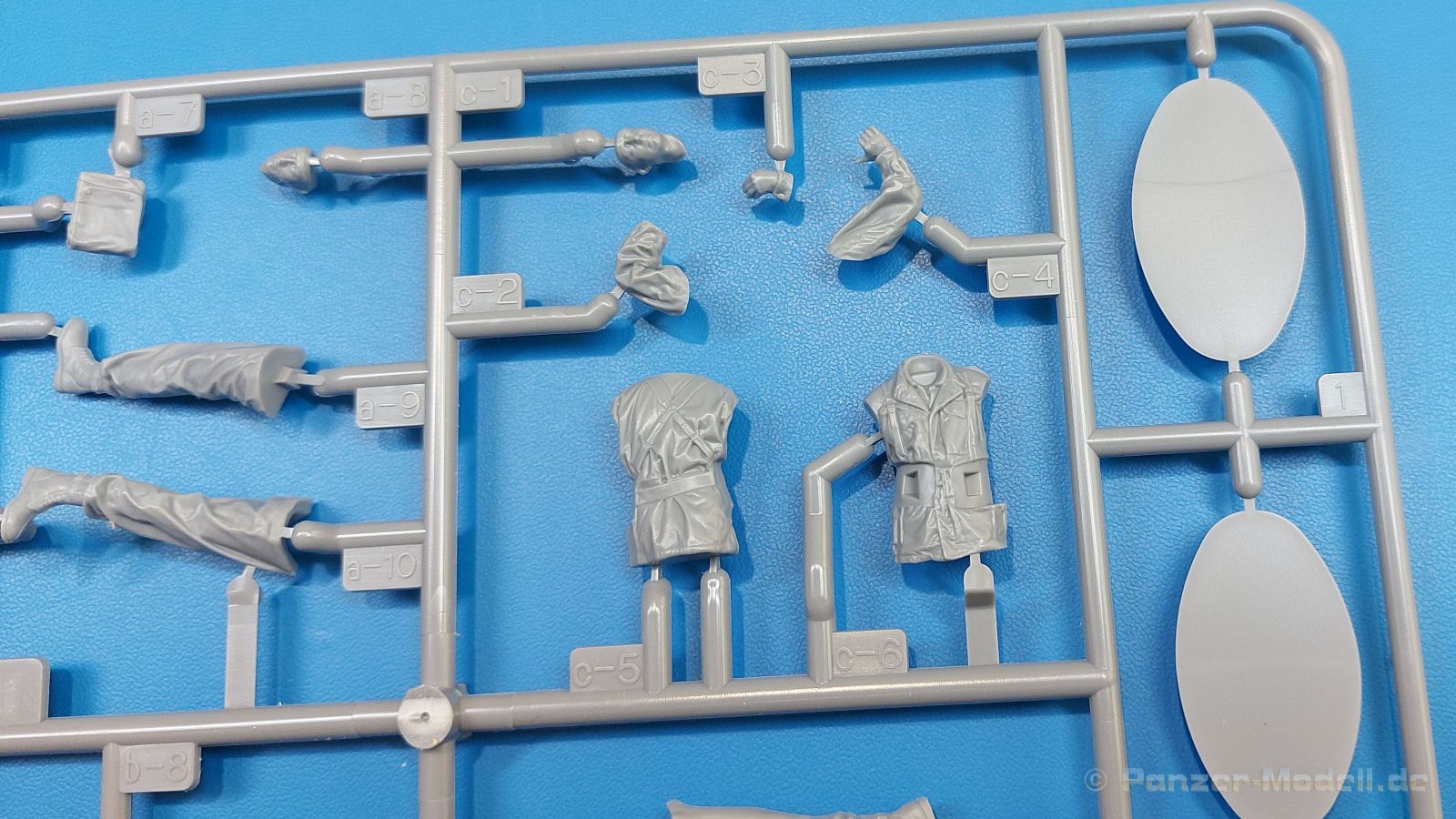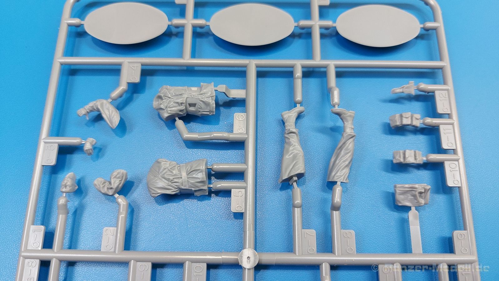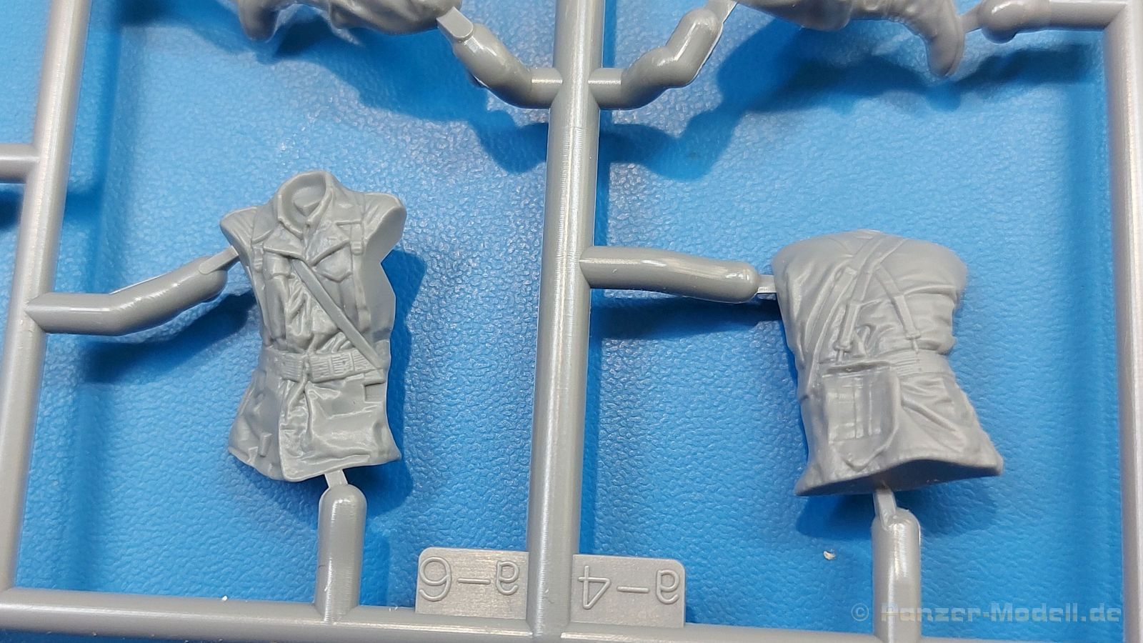 U.S. Infantry Scout Set Nach einer Weile kommt Tamiya mal wieder mit einem neuen Figurensatz. Es handelt sich um einen U.S. Aufklärungstrupp in Uniformen, wie sie ab der zweiten Jahreshälfte des Jahres 1944 üblich wurden. In einem 260 x 160 x 40 mm großen Stülpdeckelkarton mit dem Tamiya-typischen Kartonbild finden sich zwei mittelgraue Spritzlinge mit den Figuren, zwei weitere mit Waffen und Ausrüstung, ein Decalblatt und die Bauanleitung. An den Seitenrändern des Kartons sieht man, farbig dargestellt, Waffen und Ausrüstungsgegenstände, sowie deren Bezeichnung in Englisch und Japanisch. Die Spritzlinge sind sauber ausgegossen, ohne Versatz, Fischhäute oder Grat. Angüsse sind auf das notwendige Minimum reduziert. Details wie Faltenwurf und Gesichter sind gut definiert. Tamiya eben! Alle Figuren bestehen aus Kopf, zweiteiligem Rumpf, Armen und Beinen, teils auch mit separaten Händen. Das Koppelzeug ist bereits an den Rümpfen angegossen, für die Ausrüstungsgegenstände gibt es deutlich erkennbare Ansatzpunkte, damit sie sich natürlich an die Körper anschmiegen. Die Köpfe sind schön gestaltet mit guten Gesichtern. Die Doppelschnallenstiefel mit den Ledergamaschen sind echte Hingucker. Für die drei stehenden Figuren gibt es Basisplatten, falls man sie sich so in die Vitrine stellen möchte. Noch nicht so scharf detailliert wie Resin-Figuren, aber nicht sehr weit entfernt. Für Plastik absolut erste Klasse! Das Set stellt einen Aufklärungstrupp beim Orientierungshalt dar. Die Haltungen sind entspannt und man wartet darauf, bis der Funker seinen Spruch abgesetzt hat. Der Truppführer und zwei Soldaten stehen, der Funker und ein weiterer Soldat knien. Die Grundausstattung der Soldaten besteht aus Feldflasche, Bajonett, bzw. Kampfmesser, Klappspaten in Koppeltasche, Stahlhelm und der Waffe entsprechende Munitionstaschen. Bei allen Stahlhelmen ist der Kinnriemen über den vorderen Rand geschoben. Zwei Helme sind aufgegossenem Tarnnetz versehen. Wahlweise gibt es noch 6 Eierhandgranaten, die man nach Belieben anbringen kann. Trageriemen für die Waffen und das Fernglas muss man selbst herstellen, sofern man sie anbringen möchte.