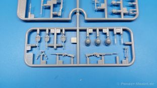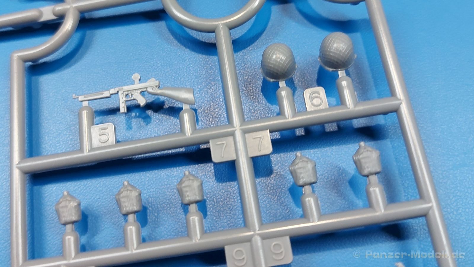 *1 Browning Automatic Rifle Der kleine Decalbogen enthält Ärmel-Rangabzeichen vom Private First Class bis hin zum First Sergeant (ausreichend für 21 Figuren) und Helmabzeichen für Offiziere (je ein First, Second Lieutenant und Captain). Die Decals sind seidenmatt mit wenig Rand. Die Bauanleitung ist ein längliches Faltblatt, das mit Arbeitshinweisen in Japanisch, Deutsch, Englisch und Französisch beginnt, gefolgt von Abbildungen der benötigten Bastelwerkzeuge und einer Aufzählung von Tamiya-Farben, die Anwendung finden würden. Die Bemalung der Grundausrüstung und Anbringung der Handgranaten wird vor den Figuren gezeigt. Jede Figur wird zusammengebaut von vorn und von hinten gezeigt. Mit den Teilenummern wird angezeigt, was wohin gehört. Farbnummern geben die Detailbemalung an. Die beiden knieenden Soldaten werden in einem Positionierungsbeispiel gezeigt. Hier taucht auch eine Landkarte auf, die man aus der Bauanleitung ausschneiden kann. Zum Schluss wird die Anbringung der Decals erklärt und gezeigt. Ich finde es lobenswert, dass man die Bezeichnung aller im Decalblatt enthaltenen Ränge angibt. Ein toller Wurf von Tamiya, der sowohl allein in einer Vignette oder in einem Diorama sehr gut aussehen wird. Anfänger werden ebenso ihre Freude daran haben wie Experten. In Deutschland werden die Figuren zwischen 19 und 20 Euro gehandelt.