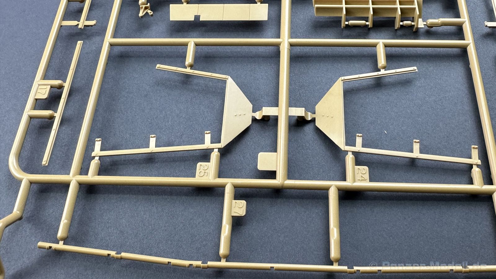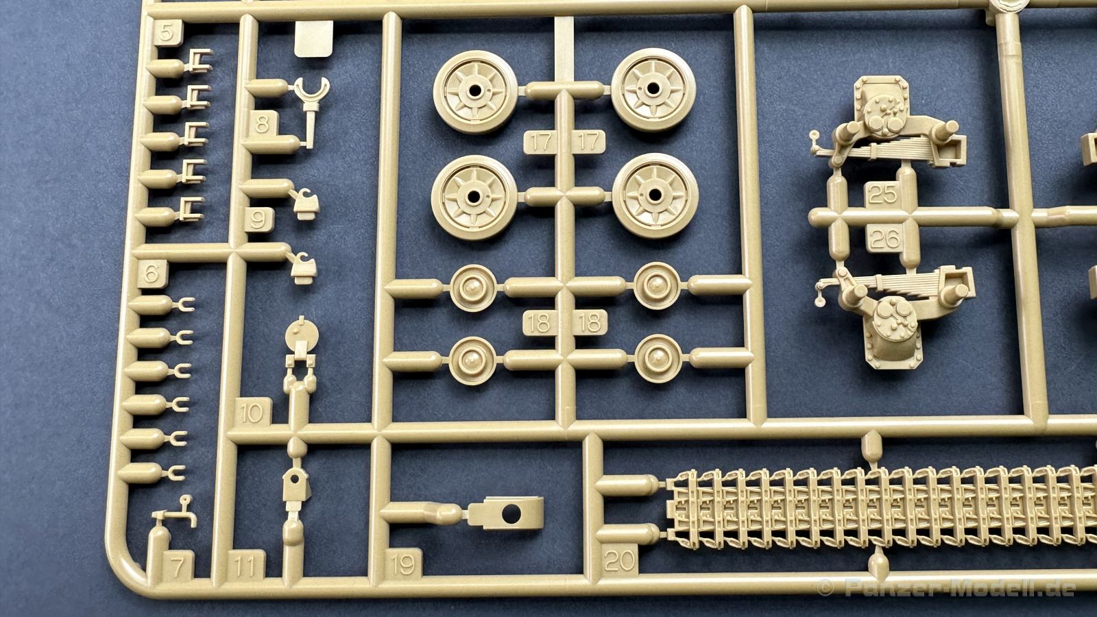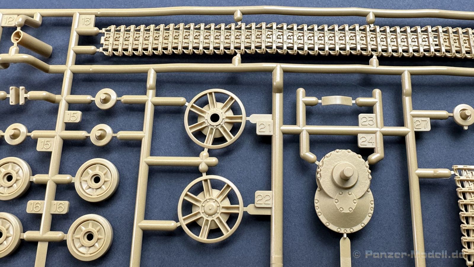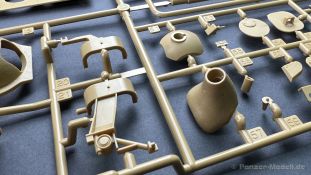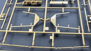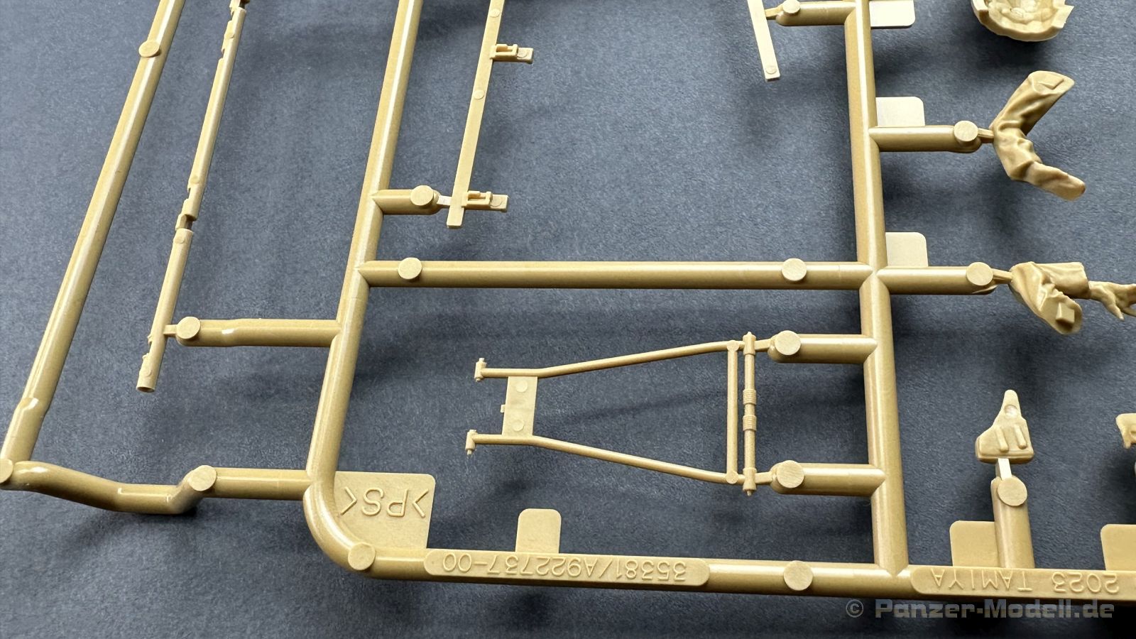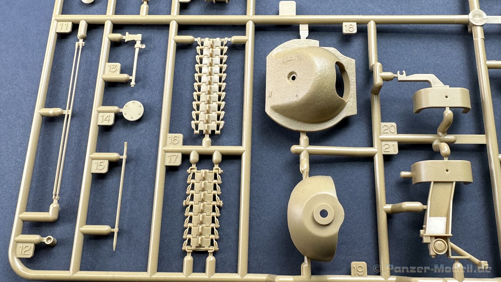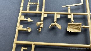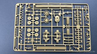 Jagdpanzer IV/70 (A) Schon vor der Spielwarenmesse wurde geleakt das Tamiya wohl einen Jagdpanzer auf Basis von ihrem Panzer IV realisieren möchte, 1-2 „verschwommene Bilder“ tauchten auch auf, aber so richtig wusste halt noch niemand wie der Panzer aussehen sollte bzw. welche Features uns wohl erwarten könnten… Das änderte sich als wir Anfang Februar die Spielwarenmesse zu Nürnberg enterten, da stand die Neuheit von Tamiya in voller Pracht! Doch Neuheit, nun ja sagen wir es einmal so: es ist nur bedingt eine Neuheit, da Teile vom Jagdpanzer vom bereits 2014 erschienen Jagdpanzer IV L70 (V) 35340 sind. Neu ist natürlich der obere Aufbau, der ja für die Alkett Version des Jagdpanzers IV angepasst worden ist und erfreulicherweise sind die übrigen Teile noch einmal einem Facelift unterzogen worden. Als Modell wird hier die Lösung von Alkett mit dem relativ hohem Aufbau dargestellt, da der Panzer IV mit dem Einbau der 7,5 cm KwK L/48 an seine Leistungsgrenze gekommen ist und aufgrund des limitierten Turmkranzdurchmesser keine größere Kanone aufnehmen konnte, wurde nach einer Lösung gesucht die leistungsstarke 7,5cm KwK L/70 zu verbauen. Mit dem Weglassen des Turmes und einer Veränderung vom Panzerkastenaufbau, ähnlich des schon bekannten Sturmgeschütz Konzeptes wurde der Jagdpanzer IV realisiert. Mit dem Bau wurde erst relativ spät begonnen, von August 1944 bis März 1945 konnten immerhin aber noch 277 Exemplare sowie ein Prototyp fertiggestellt werden. Zusammenfassend lässt sich sagen das der Jagdpanzer IV in V und A ein Erfolg war, sofern richtig eingesetzt, die relativ starke Frontpanzerung sowie die sehr starke und präzise 7,5cm L/70 standen dem völlig überlastenden vorderen Fahrwerk ( daher auch die Stahllaufrollen ) Getriebeproblemen und dem permanenten Spritmangel entgegen. Im Bausatz enthalten sind insgesamt: - 7 Spritzlinge - Ätzteilebogen für die Gitterschürzen ( Thomaschürzen ) - 3 Sorten Polycaps - Segmentkette - 1x Figur - 2x Decalvarianten Die Spritzlinge kommen in dem für späte deutsche Fahrzeuge typischen dunkelgelben/beigen Farbton daher und sind, wie es im englischen so schön heißt von den Details crisp – also absolut scharkantig abgegossen. Im allgemeinen gefallen wir die neuen Bausätze von Tamiya spitze, so wird auch hier darauf wert gelegt das wir eine Oberflächenstruktur haben die absolut angemessen ist, Schweißnähte und eine absolut durchdachte Vorgehensweise runden das Bild ab. Die Jungs von Tamiya müssen das Fahrzeug in Saumur mir Adleraugen vermessen haben, so wurden viele Merkmal exakt von diesem Fahrzeug wie die schon genannten Oberflächenstruktur übernommen, ebenso die Kette, welche eine späte, seltene Variante ist. Gut für uns, so kommt etwas Abwechslung auf den Basteltisch. Apropos Kette, hier hat Tamiya wieder sein ganzes können in die Waagschale geworfen, die Segmentkette weist Führungshilfen und eine 1a durchdachte Montage auf. Leider finden sich auf den Gummibandagen der hinteren Laufrollen keine Herstellerangaben wie Semperit, Fulda und Co auf, ich finde das könnte man in 2023 besser machen, zumal beim Original vermessen Fahrzeug in Saumur eben jene Daten zu sehen sind. Eine Figur , bzw. eine ¾ Figur liegt dem Bausatz ebenfalls bei, in Tamiya typischer Pose, relativ neu sind die modulare Bauweise ähnlich dem Dragon Gen 2 Konzept, ist zwar ein wenig aufwendiger, aber das Ergebnis ist dadurch wesentlich besser. Die Anleitung gibt insgesamt 33 Baustufen vor. Leider spendiert Tamiya nur 2 Decalvarianten, die da wären: - A 106th Panzer Brigade Western Front, Late 1944 in Dreifarbtarnung / Hinterhalt - B 17th Panzer Division, Eastern Front 1945 Dreifarbtarnung Zu finden sind die beiden Bemal Vorschläge auf einem separaten Bogen, der auch Hintergrundinformation ( in Deutsch, Englisch, Französisch und Japanisch ) sowie einige Bilder, ja sogar Bilder in Farbe enthält. Im Allgemeinen kann man die Anleitung von Tamiya gar nicht oft genug loben, alles bestens erklärt, mit Bildern untermalt und an vermeintlich kniffeligen Stellen nochmals als Bild oder Zeichnung untermauert. Das Kanonenrohr für die L/70 liegt als einteiligen in Kunststoff gespritztes teil bei das mit einem , zum Stück hohl gegossen End teil montiert werden muss. Erwähnenswert sind die Gitterschürzen die hier als Ätzteil auf einem , für Tamiya eher untypischen , großen Bogen daher kommen, absolut lobenswert!! Tamiya hat sich, zumindest auf dem Papier, schlüssige Konzept überlegt, wie man die Ätzteile mit den Kunststoffteilen verbinden kann überlegt. Die Praxis wird zeigen, ob das gut funktioniert oder ähnlich kompliziert wird wie bei Dragon damals Ich denke in der Zusammenfassung lässt sich sagen das dem geneigten Modellbauer hier ein Modell an die Hand gegeben wird, das sich A gut bauen lassen sollte, B gut recheriert ist und sich aufgrund der Beigaben so aus der Schachtel bauen lassen sollte. 2 minimale Minuspunkte möchte ich nicht unerwähnt lassen, lediglich 2 Decalvarianten und das fehlen von Details auf den Gummibandagen Absolut löblich ist der Preis, zumindest jetzt bei Erscheinen An dieser Stelle möchte ich mich bei Tamiya / Deutschland bedanken die uns hier das Muster zur Verfügung gestellt haben.