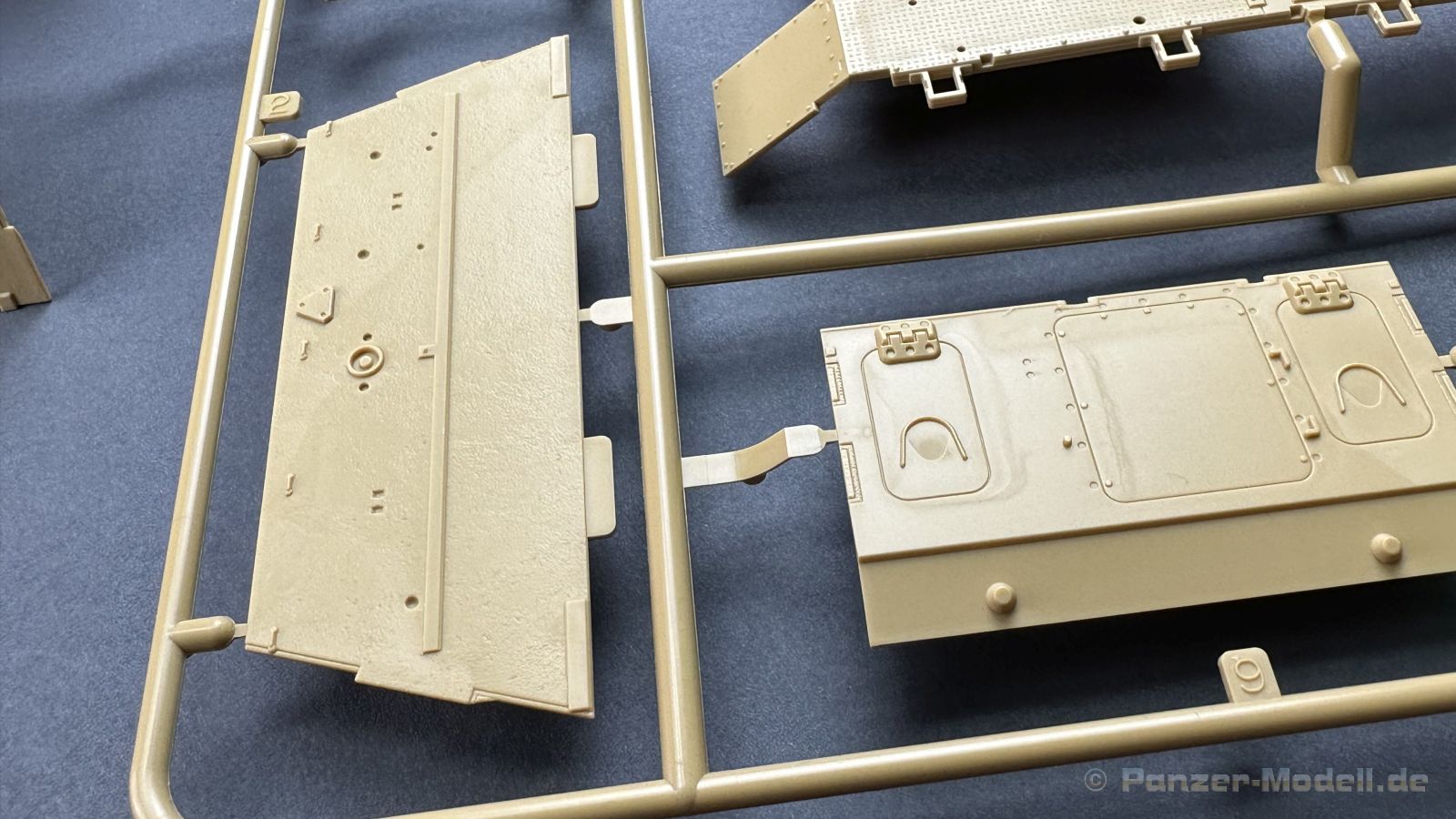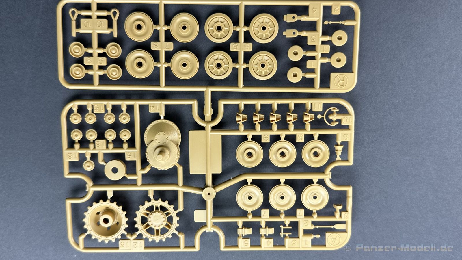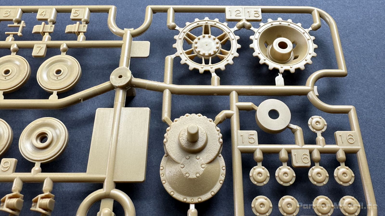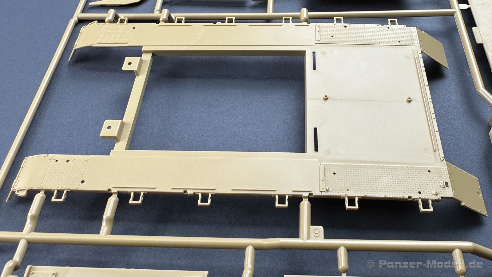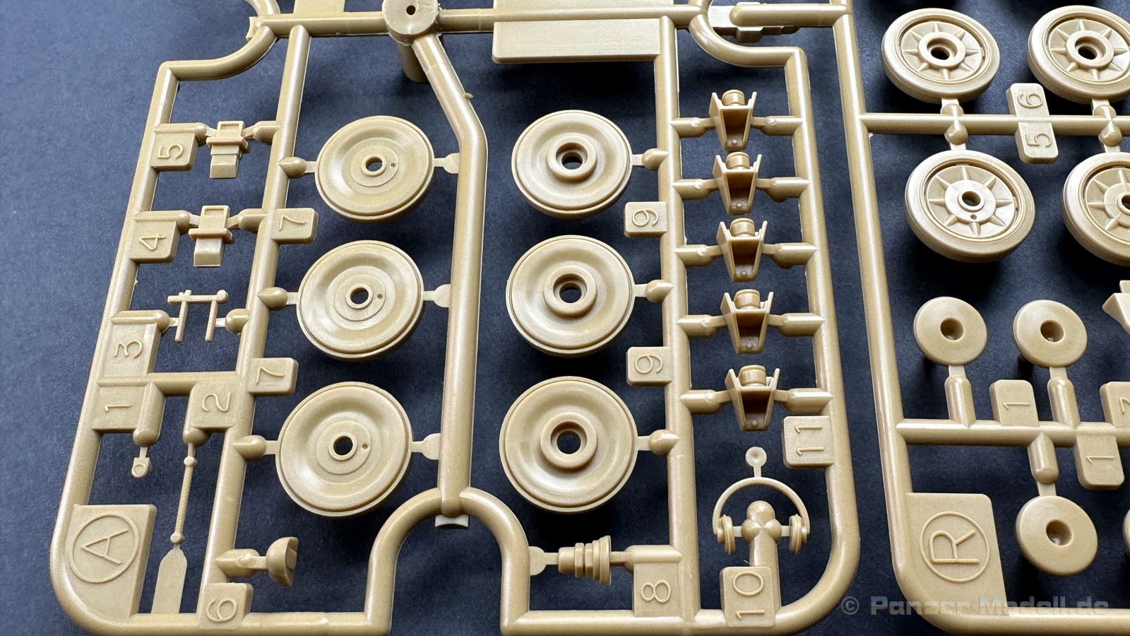 Jagdpanzer IV/70 (A) Schon vor der Spielwarenmesse wurde geleakt das Tamiya wohl einen Jagdpanzer auf Basis von ihrem Panzer IV realisieren möchte, 1-2 „verschwommene Bilder“ tauchten auch auf, aber so richtig wusste halt noch niemand wie der Panzer aussehen sollte bzw. welche Features uns wohl erwarten könnten… Das änderte sich als wir Anfang Februar die Spielwarenmesse zu Nürnberg enterten, da stand die Neuheit von Tamiya in voller Pracht! Doch Neuheit, nun ja sagen wir es einmal so: es ist nur bedingt eine Neuheit, da Teile vom Jagdpanzer vom bereits 2014 erschienen Jagdpanzer IV L70 (V) 35340 sind. Neu ist natürlich der obere Aufbau, der ja für die Alkett Version des Jagdpanzers IV angepasst worden ist und erfreulicherweise sind die übrigen Teile noch einmal einem Facelift unterzogen worden. Als Modell wird hier die Lösung von Alkett mit dem relativ hohem Aufbau dargestellt, da der Panzer IV mit dem Einbau der 7,5 cm KwK L/48 an seine Leistungsgrenze gekommen ist und aufgrund des limitierten Turmkranzdurchmesser keine größere Kanone aufnehmen konnte, wurde nach einer Lösung gesucht die leistungsstarke 7,5cm KwK L/70 zu verbauen. Mit dem Weglassen des Turmes und einer Veränderung vom Panzerkastenaufbau, ähnlich des schon bekannten Sturmgeschütz Konzeptes wurde der Jagdpanzer IV realisiert. Mit dem Bau wurde erst relativ spät begonnen, von August 1944 bis März 1945 konnten immerhin aber noch 277 Exemplare sowie ein Prototyp fertiggestellt werden. Zusammenfassend lässt sich sagen das der Jagdpanzer IV in V und A ein Erfolg war, sofern richtig eingesetzt, die relativ starke Frontpanzerung sowie die sehr starke und präzise 7,5cm L/70 standen dem völlig überlastenden vorderen Fahrwerk ( daher auch die Stahllaufrollen ) Getriebeproblemen und dem permanenten Spritmangel entgegen. Im Bausatz enthalten sind insgesamt: - 7 Spritzlinge - Ätzteilebogen für die Gitterschürzen ( Thomaschürzen ) - 3 Sorten Polycaps - Segmentkette - 1x Figur - 2x Decalvarianten Die Spritzlinge kommen in dem für späte deutsche Fahrzeuge typischen dunkelgelben/beigen Farbton daher und sind, wie es im englischen so schön heißt von den Details crisp – also absolut scharkantig abgegossen. Im allgemeinen gefallen wir die neuen Bausätze von Tamiya spitze, so wird auch hier darauf wert gelegt das wir eine Oberflächenstruktur haben die absolut angemessen ist, Schweißnähte und eine absolut durchdachte Vorgehensweise runden das Bild ab. Die Jungs von Tamiya müssen das Fahrzeug in Saumur mir Adleraugen vermessen haben, so wurden viele Merkmal exakt von diesem Fahrzeug wie die schon genannten Oberflächenstruktur übernommen, ebenso die Kette, welche eine späte, seltene Variante ist. Gut für uns, so kommt etwas Abwechslung auf den Basteltisch. Apropos Kette, hier hat Tamiya wieder sein ganzes können in die Waagschale geworfen, die Segmentkette weist Führungshilfen und eine 1a durchdachte Montage auf. Leider finden sich auf den Gummibandagen der hinteren Laufrollen keine Herstellerangaben wie Semperit, Fulda und Co auf, ich finde das könnte man in 2023 besser machen, zumal beim Original vermessen Fahrzeug in Saumur eben jene Daten zu sehen sind. Eine Figur , bzw. eine ¾ Figur liegt dem Bausatz ebenfalls bei, in Tamiya typischer Pose, relativ neu sind die modulare Bauweise ähnlich dem Dragon Gen 2 Konzept, ist zwar ein wenig aufwendiger, aber das Ergebnis ist dadurch wesentlich besser. Die Anleitung gibt insgesamt 33 Baustufen vor. Leider spendiert Tamiya nur 2 Decalvarianten, die da wären: - A 106th Panzer Brigade Western Front, Late 1944 in Dreifarbtarnung / Hinterhalt - B 17th Panzer Division, Eastern Front 1945 Dreifarbtarnung Zu finden sind die beiden Bemal Vorschläge auf einem separaten Bogen, der auch Hintergrundinformation ( in Deutsch, Englisch, Französisch und Japanisch ) sowie einige Bilder, ja sogar Bilder in Farbe enthält. Im Allgemeinen kann man die Anleitung von Tamiya gar nicht oft genug loben, alles bestens erklärt, mit Bildern untermalt und an vermeintlich kniffeligen Stellen nochmals als Bild oder Zeichnung untermauert. Das Kanonenrohr für die L/70 liegt als einteiligen in Kunststoff gespritztes teil bei das mit einem , zum Stück hohl gegossen End teil montiert werden muss. Erwähnenswert sind die Gitterschürzen die hier als Ätzteil auf einem , für Tamiya eher untypischen , großen Bogen daher kommen, absolut lobenswert!! Tamiya hat sich, zumindest auf dem Papier, schlüssige Konzept überlegt, wie man die Ätzteile mit den Kunststoffteilen verbinden kann überlegt. Die Praxis wird zeigen, ob das gut funktioniert oder ähnlich kompliziert wird wie bei Dragon damals Ich denke in der Zusammenfassung lässt sich sagen das dem geneigten Modellbauer hier ein Modell an die Hand gegeben wird, das sich A gut bauen lassen sollte, B gut recheriert ist und sich aufgrund der Beigaben so aus der Schachtel bauen lassen sollte. 2 minimale Minuspunkte möchte ich nicht unerwähnt lassen, lediglich 2 Decalvarianten und das fehlen von Details auf den Gummibandagen Absolut löblich ist der Preis, zumindest jetzt bei Erscheinen An dieser Stelle möchte ich mich bei Tamiya / Deutschland bedanken die uns hier das Muster zur Verfügung gestellt haben.