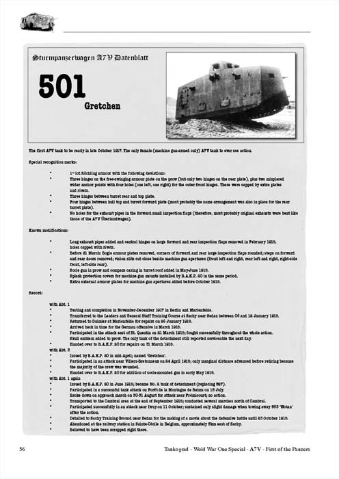 Fakt ist, dass die Autoren Rainer Strasheim und Max Hundleby auf 104 Seiten eine hervorragende Übersicht über die A7V Sturmpanzer der Deutschen mit über 130 Fotos, Zeichnungen und vor allem viel Information und technischen Daten geschaffen haben.