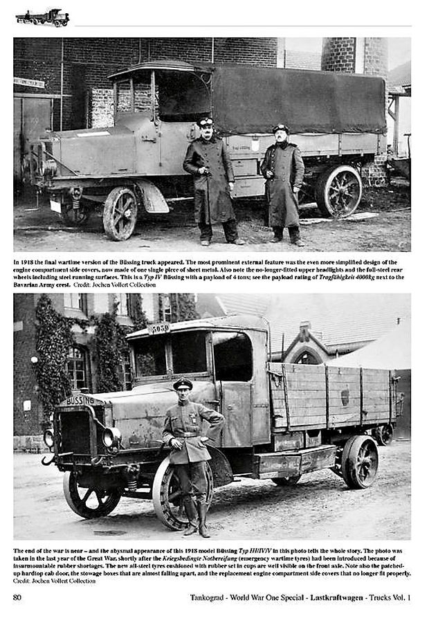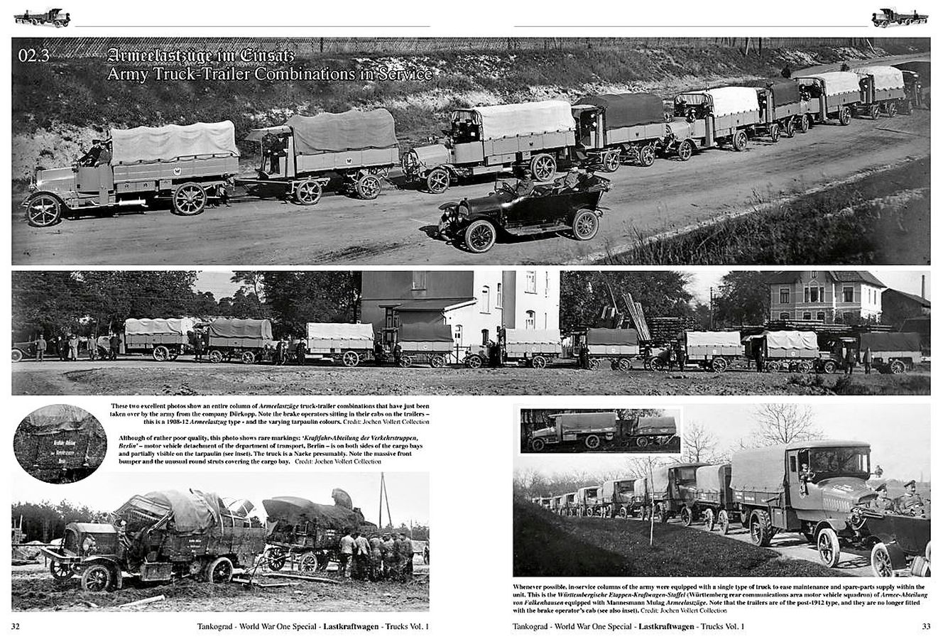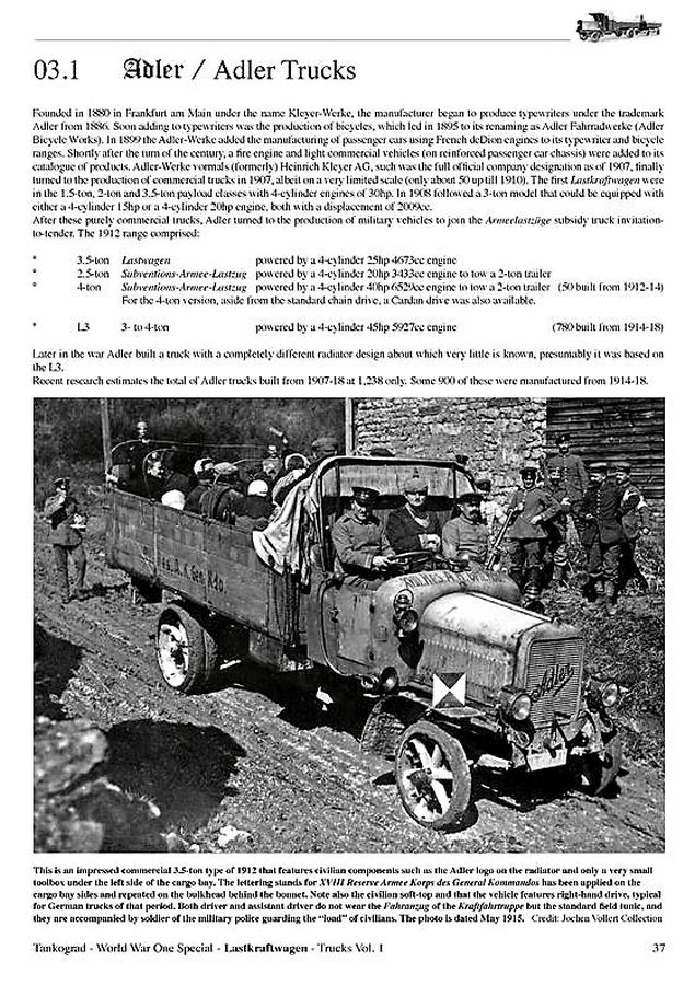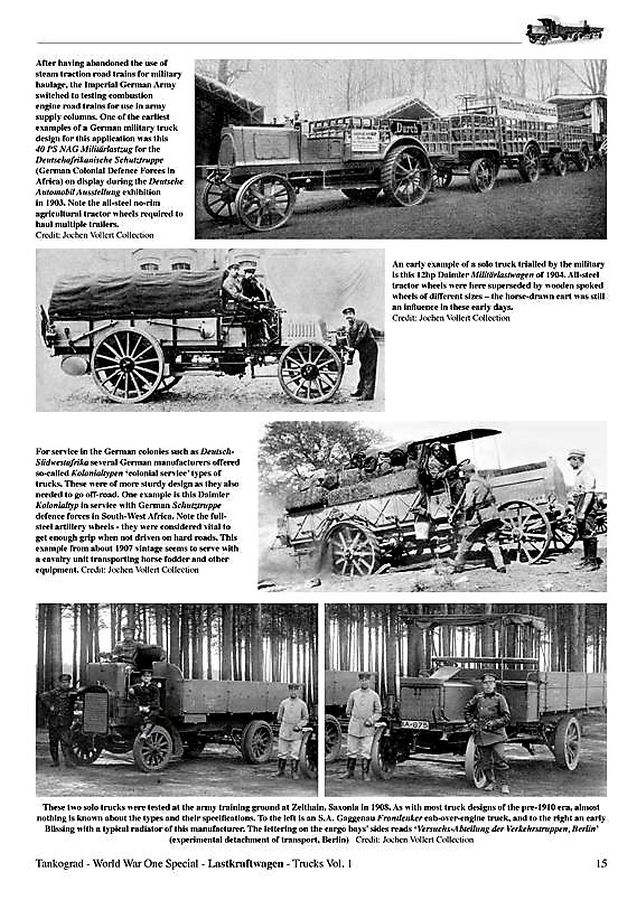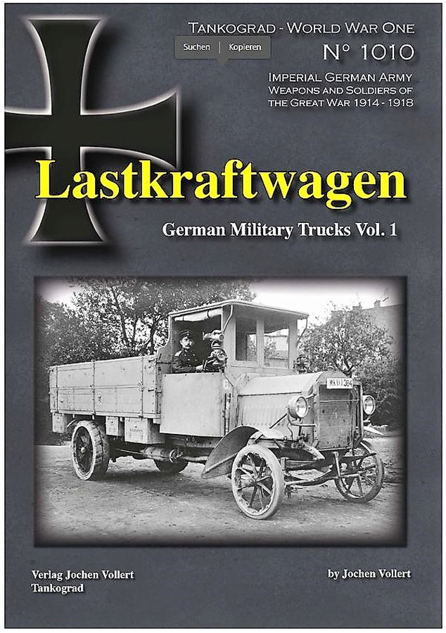 Die deutsche Heeresmotorisierung im Kaiserreich begann bereits im Jahre 1899, als der erste Lastkraftwagen und der erste Personenkraftwagen mit Verbrennungsmotor auf ihre militärische Verwendung hin getestet wurde. Ab 1908 nahm die Entwicklung richtig Fahrt auf. Erste Vergleichsversuche wurden durchgeführt um geeignete “Subventions-LKWs” für die Rolle des “Armeelastzugs” (Zugmaschine + Anhänger) zu finden. Die Versorgung der kaiserlichen Truppen an allen Fronten übernahm nach Kriegsausbruch der Solo-LKW. Zum ersten Mal erzählt eine Publikation wie der Lastkraftwagen im Ersten Weltkrieg zum Rückgrat der deutschen militärischen Nachschuboperationen avancierte. Die Entstehung und Organisation der Kraftfahrtruppe wird ausführlich in Texten dargestellt, gefolgt von reich bebilderten Kapiteln zu den Lastkraftwagen einzelner Hersteller. Dazu gehören noch heute bekannte Marken wie Benz, Daimler, Opel, Büssing, Horch, Mannesmann-Mulag und Stoewer. Aber auch heute nahezu vergessene Marken wie Ageka, Komnick und Windhoff, um nur einige zu nennen finden sich in dieser Publikation. Zusätzliche Kapitel zum Kriegsdienst sowie der damaligen Uniformen vervollständigen den Überblick über diese frühe Ära der deutschen Militärautomobilität in einer bisher nicht dagewesenen Vollständigkeit. Auf insgesamt 192 Seiten, verteilt auf zwei Bände, ist diese Publikation wieder überaus reich bebildert. Insgesamt 380 Fotografien und Abbildungen, von denen die allermeisten noch nie veröffentlicht wurden. Illustriert sind die 96 Seiten des ersten Bandes mit 152 s/w Fotos und 35 Abbildungen und Grafiken. Wie gewohnt weist das vorliegende Bildmaterial eine hervorragende Qualität auf. Die einzelnen Kapitel sind, wo angebracht, in weitere Unterkapitel aufgeteilt. Auszug aus dem Inhalt: - Motorisierung im Kaiserreich Daten undFakten Lastkraftwagen Fahrzeugidentifikation Heereswagen - Subventionswagen Armeelastzüge Armeelastzüge im Spiegel der Werbung Vergleichsfahrten Armeelastzüge im Einsatz - Heeres-/Regellastwagen (Ab hier beginnt die Auflistung der verschiedenen Hersteller) In Vol One von Adler bis Daimler. Ein umfangreiches und faszinierendes Werk, das mit der Fülle guter Fotos und Daten punktet. Eine Fundgrube für jeden Modellbauer. Wer sich zudem für diese Thematik interessiert kommt an diesem Buch nicht vorbei. Und das ist ja nur der erste Teil! Der englische Text sollte auch kein Hindernis sein. Sehr empfehlenwert! Für EUR 25,00 kann das Heft/Buch direkt beim Verlag bestellt werden Wir bedanken uns beim Verlag Tankograd, Jochen Vollert, für das Musterheft.