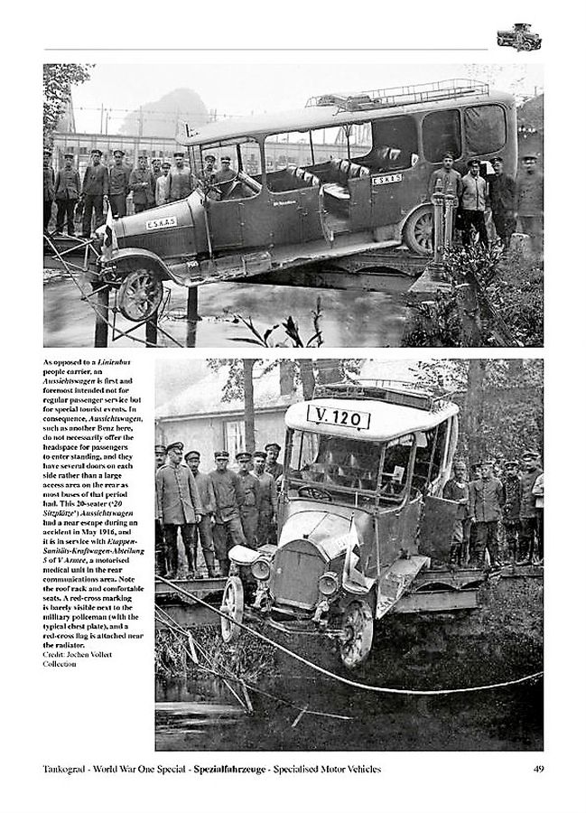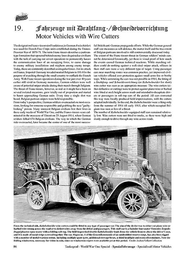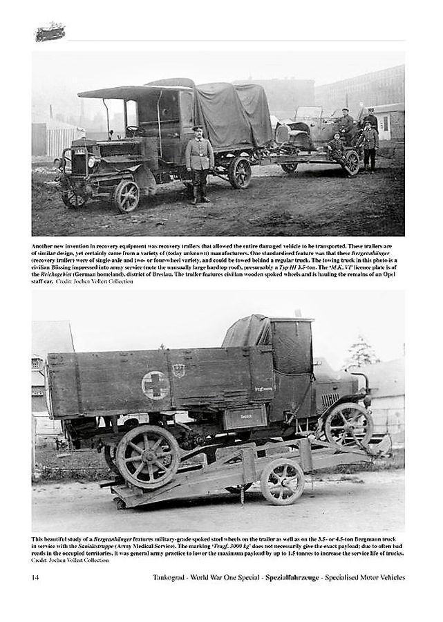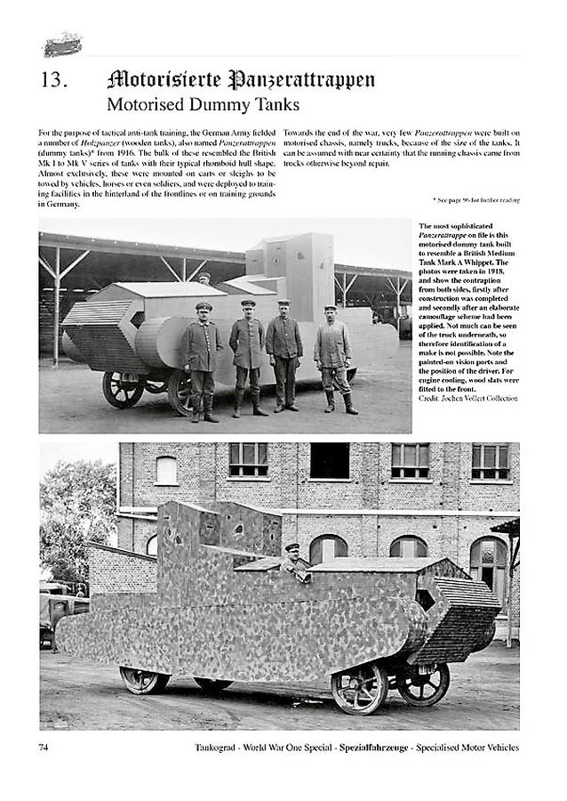 Das Rückgrat der motorisierten Fahrzeuge im Kaiserreich bildeten Lastkraftwagen, Dienstwagen und Motorräder. Durch viele neue militärischen Aufgaben auf deutscher Seite wuchs die Nachfrage im Ersten Weltkrieg nach Kraftfahrzeugen für Spezialzwecke rapide an. Diese Veröffentlichung erweitert das Spektrum der vorhergehenden Bücher dieser Reihe. Zum ersten Mal werden Spezialfahrzeuge, verteilt auf 21 Kapitel des Kaiserlichen Heeres beschrieben, die technisch interessant sind. Die Palette reicht hier von faszinierenden und seltsamen bis hin zu teilweise sonderbaren Konstruktionen. Zum ersten Mal setzt sich ein Buch mit den verschiedenen Varianten und Einsätzen dieser Spezialfahrzeuge auseinander. Eine Veröffentlichung in dieser Form ist bis heute noch nicht erschienen! Auszug aus dem Inhalt: - Propellerschlitten Illustriert sind die 96 Seiten des zweiten Bandes mit 230 s/w Fotos. Wie gewohnt weist das vorliegende Bildmaterial (Aufnahmezeitpunkt berücksichtigen!) eine hervorragende Qualität auf. Beachtenswert ist aber auch das Umfeld an denen die Fotos entstanden sind. Uniformen, Gebäude, Bodenbeschaffenheit usw. Ein weiteres, umfangreiches und faszinierendes Werk, das mit der Fülle guter Fotos und Daten punktet. Eine Fundgrube für jeden Modellbauer und gleichzeitig eine faszinierende Zeitreise in die Vergangenheit. Wer sich zudem für diese Thematik interessiert, kommt an diesem Band nicht vorbei. Der englische Text sollte auch kein Hindernis sein. Sehr empfehlenwert! Für EUR 25,00 kann das Heft/Buch direkt beim Verlag bestellt werden Wir bedanken uns beim Verlag Tankograd, Jochen Vollert, für das Musterheft.