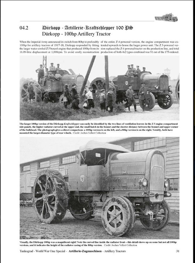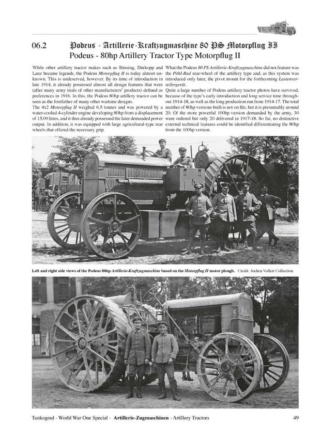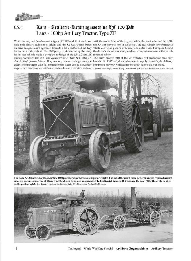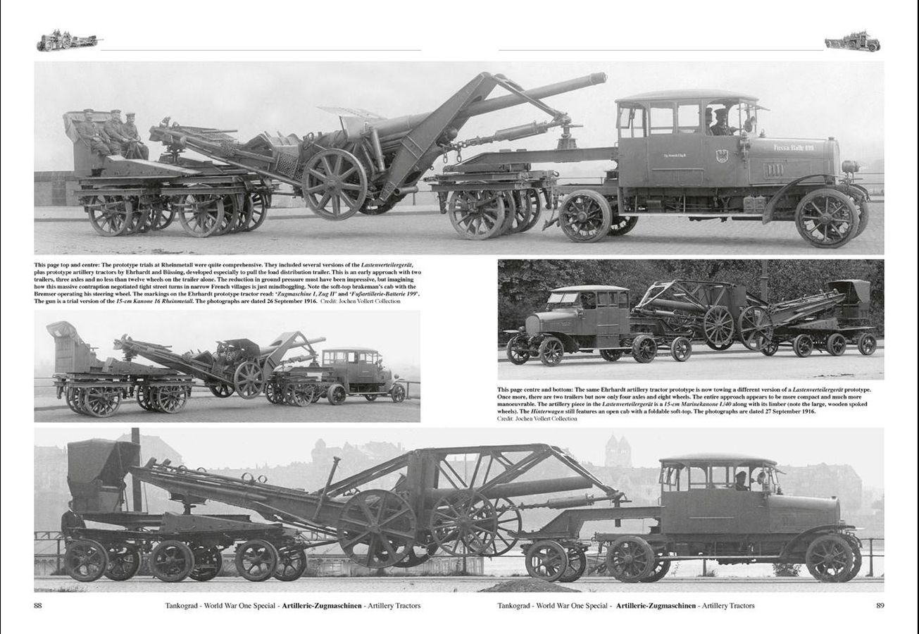 In der Reihe World War One erschien mit der Nr. 1014 erneut ein weiterer, höchst interessanter Band, diesmal zum Thema Artillerie Zugmaschinen (German Wheeled Artillerie Tractors) von Jochen Vollert. Das Heft/Buch (DIN A4 / Softcover) kommt mit Klebebindung und ist wieder auf insgesamt 999 Exemplare limitiert. Das Werk ist allerdings nur auf englisch erhältlich. Kurz vor Beginn des 1ten Weltkriegs begann die deutsche Heeresleitung mit massiven Prüfungen, inwieweit sich Traktoren und landwirtschaftliche Schlepper mit Verbrennern als Zugmittel für die schwere Artillerie eignen würden. Viele deutsche Hersteller folgten den Ausschreibungen und lieferten ihre Produkte zu den Versuchen. Basierend auf den gewonnenen Erkenntnissen wurden Eckdaten für militärisch nutzbare Artilleriezugmaschinen definiert die ab 1916 zu neuen verbesserten Entwürfen führte. Die vorliegende Publikation ist die erste Monografie zu diesem Thema und stellt dabei die Geschichte dieser riesigen Kraftfahrzeuge (mit Benzolmotoren) in zahlreichen bildgewaltigen Fotos detailliert vor. Die Veröffentlichung erweitert das Spektrum der vorhergehenden Bücher dieser Reihe. Zum ersten Mal werden Artilleriezugmaschinen, verteilt auf 21 Kapitel der Kaiserlichen Armee beschrieben, die technisch sehr interessant sind. Die Palette reicht hier von faszinierenden und seltsamen bis hin zu teilweise sonderbaren und kuriosen Konstruktionen. Die abgehandelten Fahrteugtypen umfassen dabei bekannte und unbekannte Hersteller: Büssing, Dürkopp, Lanz, Podeus, Daimler, Benz, Standard-Motorpflug (Arator), Fürstlich Stolberg’sches Hüttenamt (Ilsenburg), Kaelble, Horch, Sendling, Hanomag, Stock und Ehrhardt. Ein eigenes Kapitel behandelt das (kuriose) Bräuer’sche Lastenverteilgerät. Illustriert sind die 96 Seiten durchgehend mit 215 s/w Fotos. Wie gewohnt weist das vorliegende Bildmaterial (Aufnahmezeitpunkt berücksichtigen!) eine hervorragende Qualität auf. Beachtenswert ist aber erneut auch das Umfeld an denen die Fotos entstanden sind. Uniformen, Gebäude, Bodenbeschaffenheit usw. Ein weiteres, umfangreiches und faszinierendes Werk, das mit der Fülle guter Fotos und Daten punktet. Eine Fundgrube für jeden Modellbauer und gleichzeitig eine faszinierende Zeitreise in die Vergangenheit. Wer sich zudem für diese Thematik interessiert, kommt an diesem Band nicht vorbei. Der englische Text sollte auch kein Hindernis sein, da relativ sparsam gehalten. Sehr empfehlenwert! Eine Publikation, die man immer wieder gerne zur Hand nimmt. Für angemessene EUR 25,00 kann das Heft/Buch direkt beim Verlag bestellt werden Wir bedanken uns beim Verlag Tankograd, Jochen Vollert, für das Musterheft.