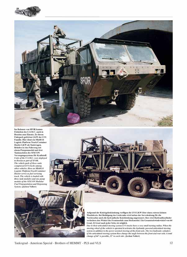 Hier wird besonders auf das LVS ( Logistic Vehicle System ) des U.S.M.C. und das PLS ( Palletized Load System ) der U.S. Army eingegangen. Mit 120 Farbfotos und 6 Grafiken werden die unterschiedlichen Fahrzeuge auf Basis des HEMTT während Ausbildung, Übung und Einsatz gezeigt. So finden sich reichlich Fotos von verschiedenen Fahrzeugversionen, unterschiedlicher Beladung, Be- und Entladetätigkeiten durch die Fahrzeugbesatzungen sowie eine Fülle an technischen Informationen und viele Hinweise auf besondere Details. Ein tolles Nachschlagewerk für die Fans der modernen U.S. Lkw.