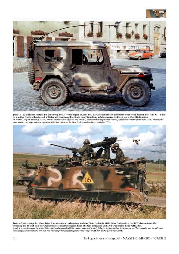 Dieses Heft zeigt die Entstehungsgeschichte der drei Tarnschemen und bietet dazu umfassendes Vorbildmaterial mit Fahrzeug-Farbfotos und den unterschiedlichen Farbmustern. Die Thematik der Tarnanstriche ist jeweils sehr umfangreich beschrieben und mit entsprechendem Bildmaterial und Skizzen sowie Tarnplänen versehen. Zusätzlich enthalten ist eine Farbtafel auf der die MASSTER-, die MERDC-, die DUALTEX- und die Nato-drei-Farb-Tarnung nach der Federal Standard Norm aufgeführt wurde.