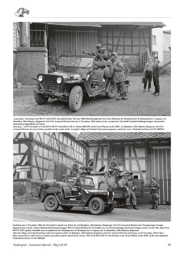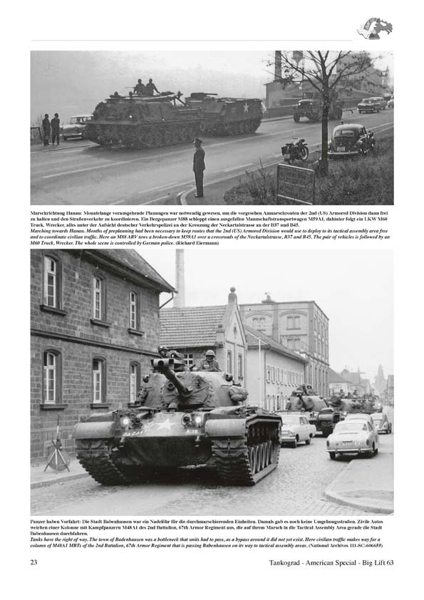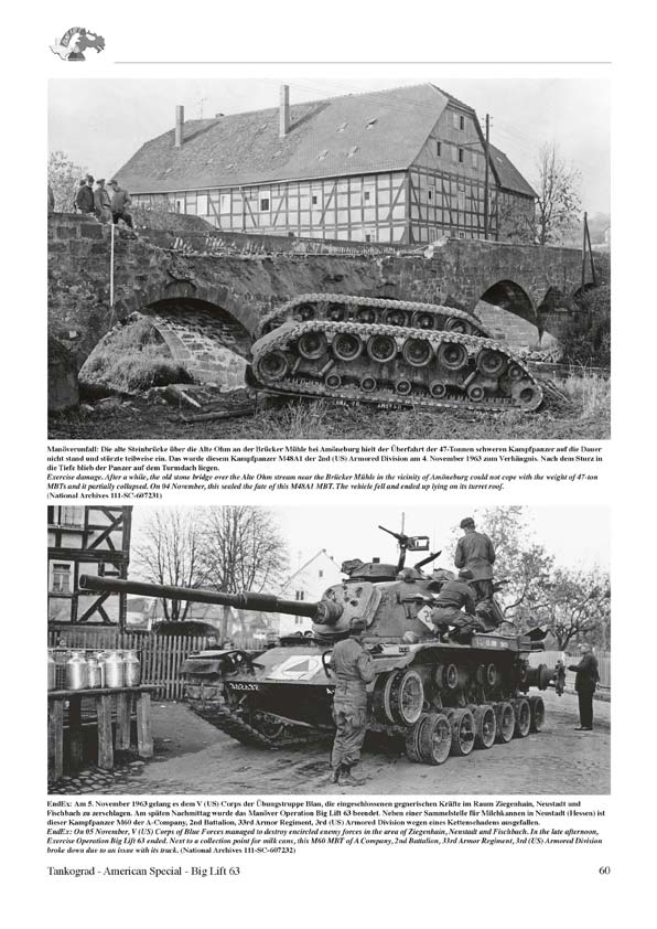 45.000 Mann mit 800 Kampfpanzern, 6.500 Kettenfahrzeugen, 12.000 Radfahrzeugen und 1.200 Flugzeugen. Diese heute fast unbegreiflichen Eckdaten definieren das Luftbrückenmanöver Operation Big Lift 63, der Verlegung auf dem Luftweg (Strategic Airlift) der verstärkten 2nd (US) Armored Division von Fort Hood, Texas nach Deutschland. Mit ihm sollte 1963 den NATO-Partnern bewiesen werden, dass die USA in der Lage waren, innerhalb kürzester Zeit große Verbände über den Atlantik nach Mitteleuropa zu verlegen, falls neue politische Spannungen zwischen Ost und West auf einen Krisenhöhepunkt zusteuern sollten. Bei dem anschließenden Einsatz der 2nd (US) Armored Division während der Gefechtsübungsphase lag der Schwerpunkt auf dem Führen eines Gegenschlages auch unter Einsatz von Atomwaffen. Zunächst wird die Übung BIG LIFT 63 mit einem ausführlichen Text beschrieben. Hier bekommt der geneigte Leser umfangreiche Informationen zur Übung, zu den Übungszielen, den einzelnen Übungsphasen, zu den Übungsräumen, zur Truppeneinteilung und zum Manöverszenario. Ab Seite 6 wird die Phase 1, die Durchführung der Luftbrücke beschrieben. Danach geht es ab Seite 9 weiter mit der Herstellung der Gefechtsbereitschaft, Straßenmarsch und der Aufstellung im Bereitstellungsraum. Ab Seite 30 beginnt Phase III, die Gefechtsübung. Nach einer Textbeschreibung folgen zahlreiche Fotos mit informativen Bildunterschriften. Besonders interessant finde ich die Fahrzeugmarkierungen und vor allem die angebrachten Manöver-Kennzeichnungen. Auch ein M48 Kampfpanzer mit einem als Notbehelf angebrachten Zusatztank aus vier 200 Liter-Fässern verdient besondere Beachtung. Auch ein Manöverunfall wird dokumentiert. Ein M48 stürzte von einer Brücke und blieb auf dem Turmdach liegen. Man kann nur hoffen dass die Besatzung diesen Unfall überlebte. Ab Seite 61 geht es weiter mit Phase IV, Rückführung der Manövertruppen und als Abschluss gibt es noch eine kurze Zusammenfassung der Übung. Die umfangreiche Beschreibung der Übung und die tollen Fotos machen dieses Heft äußerst empfehlenswert. Zwar gibt es nur sehr wenige Farbfotos, aber man darf nicht vergessen dass diese Übung im Jahre 1963 stattfand. Und das ist ja nun schon 53 Jahre her… Anzahl Fotos und Illustrationen: 8 Farbfotos, 109 s/w Fotos und 5 Grafiken Text Sprache: Komplett Deutsch und Englisch Seitenanzahl: 64 Das Heft kann zum Preis von 14,95 € direkt über den Verlag bezogen werden.