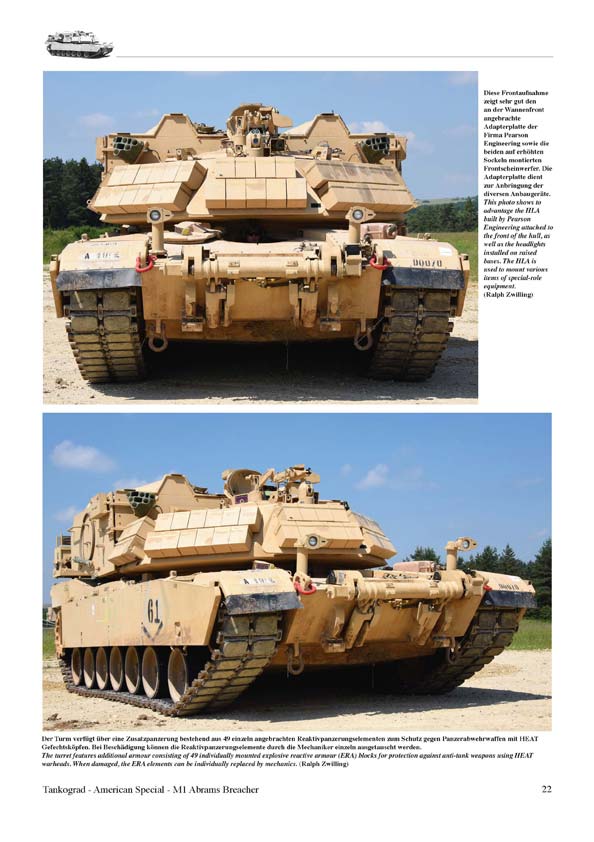 Der Pionierpanzer M1 Breacher ABV - Entwicklung und Technik Der Pionierpanzer M1 Assault Breacher Vehicle (ABV) ist der neueste und lange erwartete Zugang zur M1 Abrams-Panzerfamilie. Eingeführt von der U.S. Army und dem U.S. Marine Corps markiert der M1 ABV das Ende einer sehr langen und schwierigen Suche der U.S. Streitkräfte nach einem Fahrzeug zum Räumen von Minen, das aber auch als Bulldozer zum Beseitigen von Gefechtsfeldhindernissen oder zum Anlegen von Feuerstellungen verwendet werden kann. Das USMC hat mittlerweile 52 M1 ABV eingeführt, die U.S. Army beschaffte 187 Fahrzeuge. Das Heft beginnt einführend mit der Entwicklungsgeschichte des M1 Panther II und einem Foto-Walkaround. Ab Seite 12 folgt dann der Bericht zum M1 Breacher ABV. Das gigantische und sehr futuristisch aussehende Fahrzeug wird ausführlich beschrieben, untermauert durch zahlreiche Fotos vom Einsatz in Afghanistan und während einer Übung. Das Räumen einer Minensperre erfolgt kurz gesagt durch den Abschuss einer Rakete. An dieser Rakete befindet sich eine Minenräumschnur. An dieser Schnur befindet sich jeweils im Abstand von 30cm ein 2,3 kg C4 Sprengstoffpaket. Nach dem Aufschlag wird die Sprengung ausgelöst und dadurch eine Minengasse von 14 x 100 Meter geräumt. Auf drei Fotos ist sehr gut das gewaltige Ausmaß der Explosion zu erkennen, da der M1 Breacher ABV ebenfalls auf diesen Bildern zu sehen ist und man so einen sehr guten Größenvergleich bekommt. Ab Seite 21 folgt dann eine umfangreiche Beschreibung des Fahrzeugs, reichlich bebildert mit jeweils sehr informativen Bildunterschriften in einem detaillierten Walkaround gezeigt. Wanne, Turm, Kampfraum, Minenräumschnur und das Markierungssytem werden ausführlich beschrieben. Auch die Beladung mit dem MICLIC-Container wird gezeigt. Abschließend kann man nur sagen dass auch dieses Heft ein Volltreffer ist. Sehr gut, sehr umfangreich und äußerst informativ. Beziehen kann man das Heft direkt über den Verlag zum Preis von 14,95 EUR. Anzahl Fotos und Illustrationen: 153 Farbfotos Text Sprache: Komplett Deutsch und Englisch Seitenanzahl: 64