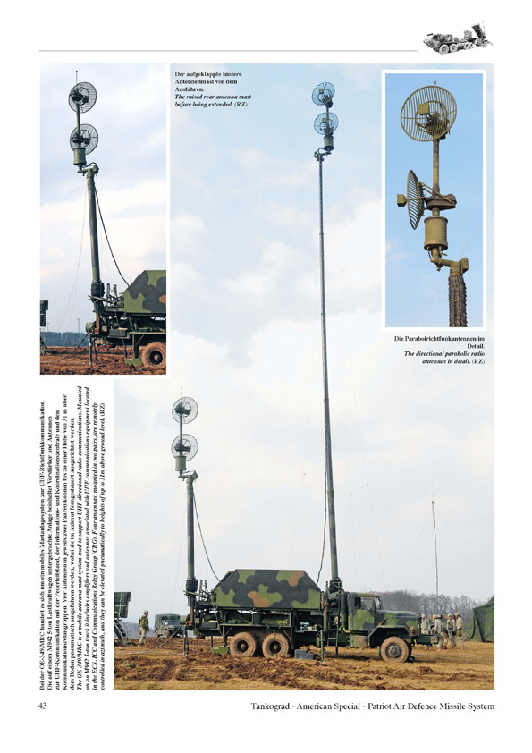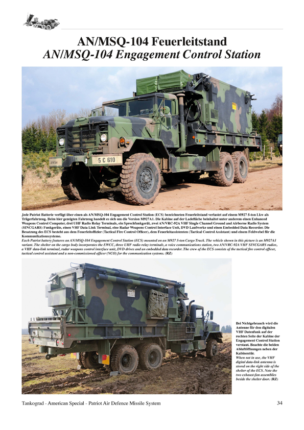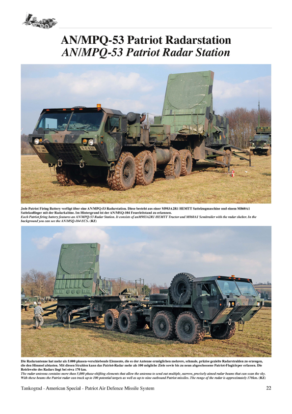 Die Aufgabe der Patriot-Bataillone und -Batterien der US Streitkräfte besteht darin, Flugabwehrschutz für kritische Anlagen und Kampfverbände der Korps sowie der den Korps übergeordneten Einheiten gegen alle Arten von Bedrohungen aus der Luft zu gewährleisten. Aufgrund der Feuerkraft, der Reichweite und der Bekämpfungshöhe des Patriot-Flugabwehrraketensystems ist es dessen Auftrag, die Flugabwehr vom Boden bis in große Höhen durchzuführen. Das Heft beginnt mit einer ausführlichen Beschreibung zur Entwicklung des Patriot-Systems, dem Auftrag, der Gliederung eines Patriot-Bataillon und Beschreibung eines Patriot Flugkörpers. Es werden nicht nur die Primärfahrzeuge wie das Startgerät und die Radarstation vorgestellt, sondern auch umfassend und detailliert die zahlreichen Unterstützungsfahrzeuge auf HEMTT, M939 5-ton und HMMWV Lastkraftwagen. Nachdem Trumpeter vor einigen Wochen den 1:35 Bausatz eines Patriot-Systems heraus brachte kommt dieses Heft sehr gelegen. Ab Seite 12 wird das MIM-104 Patriot Startgerät vorgestellt. Von Gesamtaufnahmen geht es über Detailfotos ab der Seite 22 zur AN/MPQ-53 Patriot Radarstation. Ab Seite 30 wird dann die M983A2R1 HEMTT Sattelzugmaschine beschrieben. Anschließend folgen tolle Fotos vom AN/MSQ-104 Feuerleitstand auf einem M927 Lkw. Anschließend geht es weiter mit der Informations- und Führungszentrale, dem taktischen Führungssystem, der Antennenmastanlage und der Kommunikationsrelaisgruppe. Fotos aus dem Inneren der Aufsatzkabine sind verständlicher Weise nicht vorhanden. Auch das Stromerzeugeraggregat III, der Flugkörpertransporter und der Batteriegefechtsstand fehlen nicht in diesem, wirklich sehr informativen und umfangreich bebilderten, Heft. Den Abschluss bilden dann Fotos und kurze Beschreibungen der Patriot-Unterstützungsfahrzeuge. Anzahl Fotos und Illustrationen: 128 Farbfotos Text / Sprache: Komplett Deutsch / Englisch Seitenanzahl: 64