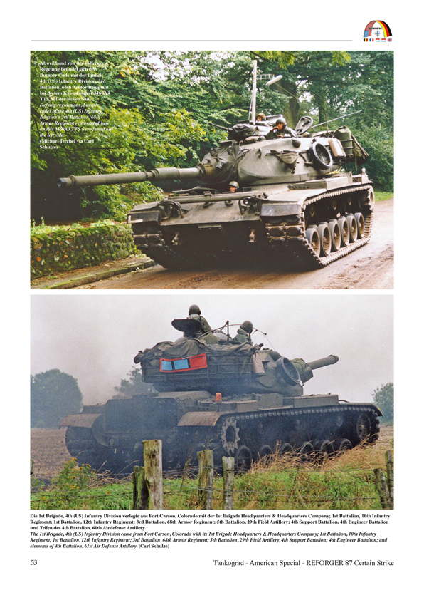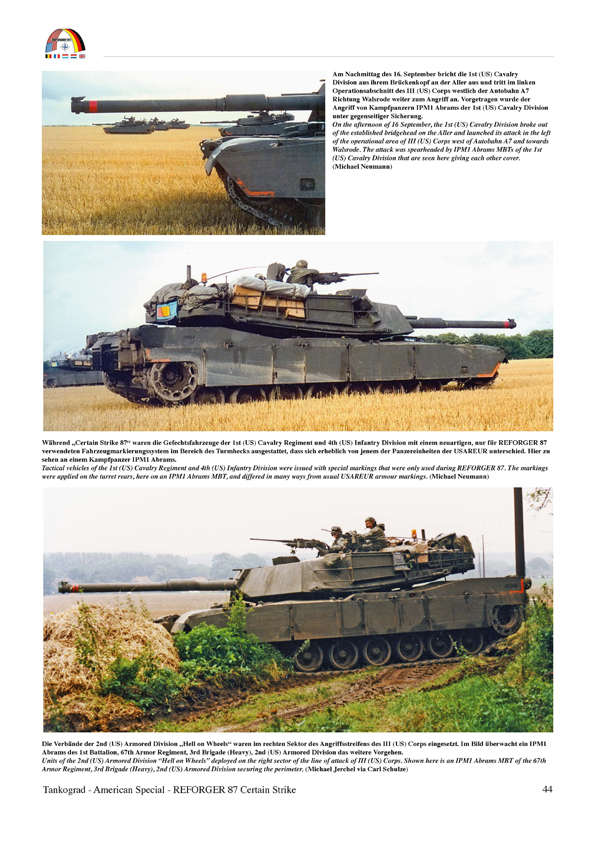 Reforger 87 war die größte Truppenbewegung im Rahmen aller Reforger Übungen. Tankograd hat sich mit seinem Heft diesem und der darin inkludierten Übung Certain Strike angenommen. Im 9-seitigen Textteil zu Beginn erfahren wir etwas über den Rahmen der Übung und Verbindung zu anderen Manövern wie Certain Strike, Autumn Forge 87 und Cold Fire 87. Neben dem Manöverablauf werden die Einheiten der Teilnehmer aufgeführt und wer zur Übungstruppe Orange und wer zu Blau gehörte. Eine große Karte zeigt die Übungsräume in Deutschland. Der Bildteil folgt dem zeitlichen Anlauf und gliedert sich in folgende Abschnitte: - Übernahme schweres Gerät aus den POMCUS Depots, Bereitstellungsraum, Verlegung in die Sammelräume und Einsatzräume, 28. August bis 09. September 1987 - Aufklärungsoperationen der Übungstruppe Orange im nördlichen Verteidigungsabschnitt der 1. Panzerdivision Übungstruppe Blau, 14.15. September 1987 - Offensive Operationen der Übungstruppe Blau und Gewässerübergang an der Aller durch Kräfte des III (US) Korps am Mittwoch, 16. September 1987 - Gegenangriff Blau am Freitag, den 18. September 1987 - Panzergefecht bei der Ortschaft Willingen vor Soltau am 18. September 1987 - Die zweite Woche von "Certain Strike 87" 21. bis 24. September 1987 Man bekommt eine Unzahl an Fahrzeugtypen zu sehen wie z.B. M113, M3 Bradley, M728, M1, M60, M109, M110, M88, Challenger, Scorpion und, und, und. Alle aufzuzählen, würde den Rahmen sprengen. Interessant ist auch die Vermischung der damals gebräuchlichen Fahrzeugtarnfarben von einfarbig Olive drab über MERDC bis hin zu NATO 3-Farb-Tarnung. Auch feldmäßig angebrachte Schlammtarnung, Verwendung von Tarnnetzen und Zweigen ist ebenso zu sehen wie die Verschmutzungsgrade von depotsauber bis schlammbedeckt. Festgefahrene Panzer und entsprechende Bergeaktionen werden die Fantasie der Dioramenbauer anregen. Für mich eine Erinnerung an eine Zeit, als ich selbst noch in der Bundeswehr diente und an solchen Übungen teilgenommen habe, für andere ein interessanter Einblick, was und wie damals in der Öffentlichkeit geübt wurde. Der Preis beträgt EUR 14,95 (zzgl. Versandkosten) direkt ab Verlag.