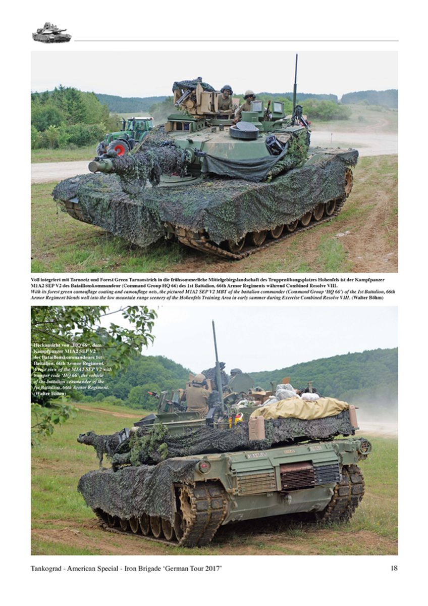 Der Bildteil gliedert sich dieses Mal nach den Einheiten der Brigade, die da wären: - 1st Battalion, 66th Armor Regiment “Iron Knights” Jeder Abschnitt (Brigade Headquarters ausgenommen) startet mit einer Grafik zur Gliederung der Einheit in taktischen Symbolen. Auf der Zug-Ebene sieht man dann die zugehörigen Fahrzeuge einer Kompanie wie z.B. Kompanietrupp Fahrzeuge und die einzelnen Züge. Die Grafik fällt bei der Versorgungseinheit „etwas“ größer aus. Je nach Alter der Einheiten sind auch ein paar Fotos aus der Vergangenheit dabei; z.B. M48A1 im Jahr 1963 des 1st Battalion, 66th Armor Regiment. Alle anderen Aufnahmen widmen sich den aktuellen Fahrzeugen im Ausrüstungs- und Beladungsstand während der 2017-er Tour. Es sind fast keine Fahrzeuge im NATO 3-Farbtarn dabei. Sie sind einfarbig in Grün oder Sandgelb und mit verschiedensten Ausrüstungsgegenständen bepackt und oftmals mit Tarnnetzen an Turm und Wanne versehen. Ein Heft mit reichlich Vorbildmaterial für Vignetten und Dioramen - fast bis auf’s Metall abgefahrene Kettenpolster, am Fahrzeug mitgeführte S-Drahtrollen, Leitradreparatur auf der Straße und, und, und. Durch die großformatigen und gestochen scharfen Fotos kann man alles gut erkennen und identifizieren. Der Preis beträgt unverändert seit Jahren EUR 14,95 (zzgl. Versandkosten) direkt ab Verlag.