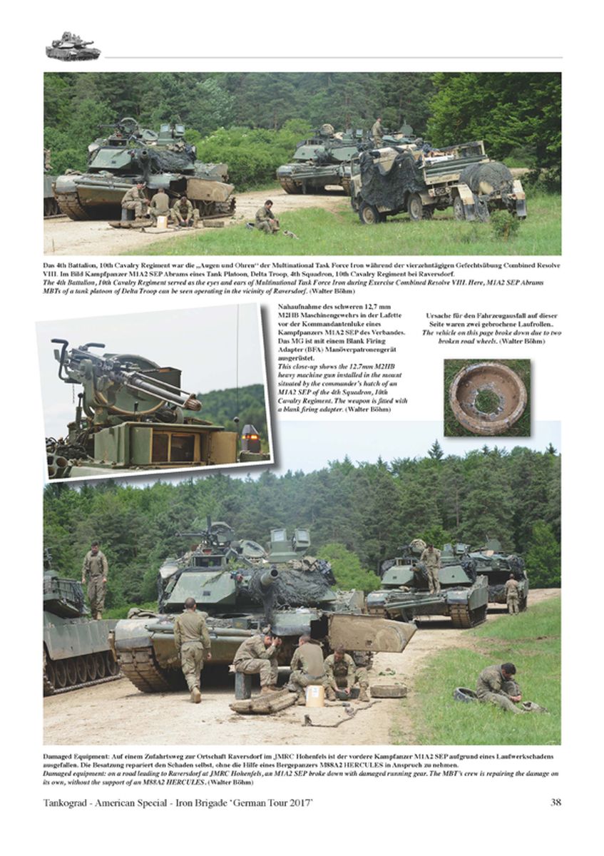 Autor: Walter Böhm Unter dem Titel „Iron Brigade“ liefert uns Tankograd wieder eine gute Mischung an US-amerikanischen Gefechtsfahrzeugen. Genauer gesagt sind es die Fahrzeuge der 3. Armored Brigade Combat Team der 4. US Infantry Division bei ihrer Deutschlandtour im Jahr 2017. Bereits auf dem Cover begrüßen uns die 3 Hauptwaffen der Brigade Kampfpanzer Abrams, Schützenpanzer Bradley und die M109. Eine Grafik auf der Innenseite zeigt uns die Gliederung der Brigade mittels taktischer Symbole. Zum Einstieg erhalten wir wie üblich 2-spaltig (1 Spalte Deutsch, 1 Spalte Englisch) explizite Erklärungen zur Brigade und ihren Aktivitäten. Kurz aufgelistet sind dies: