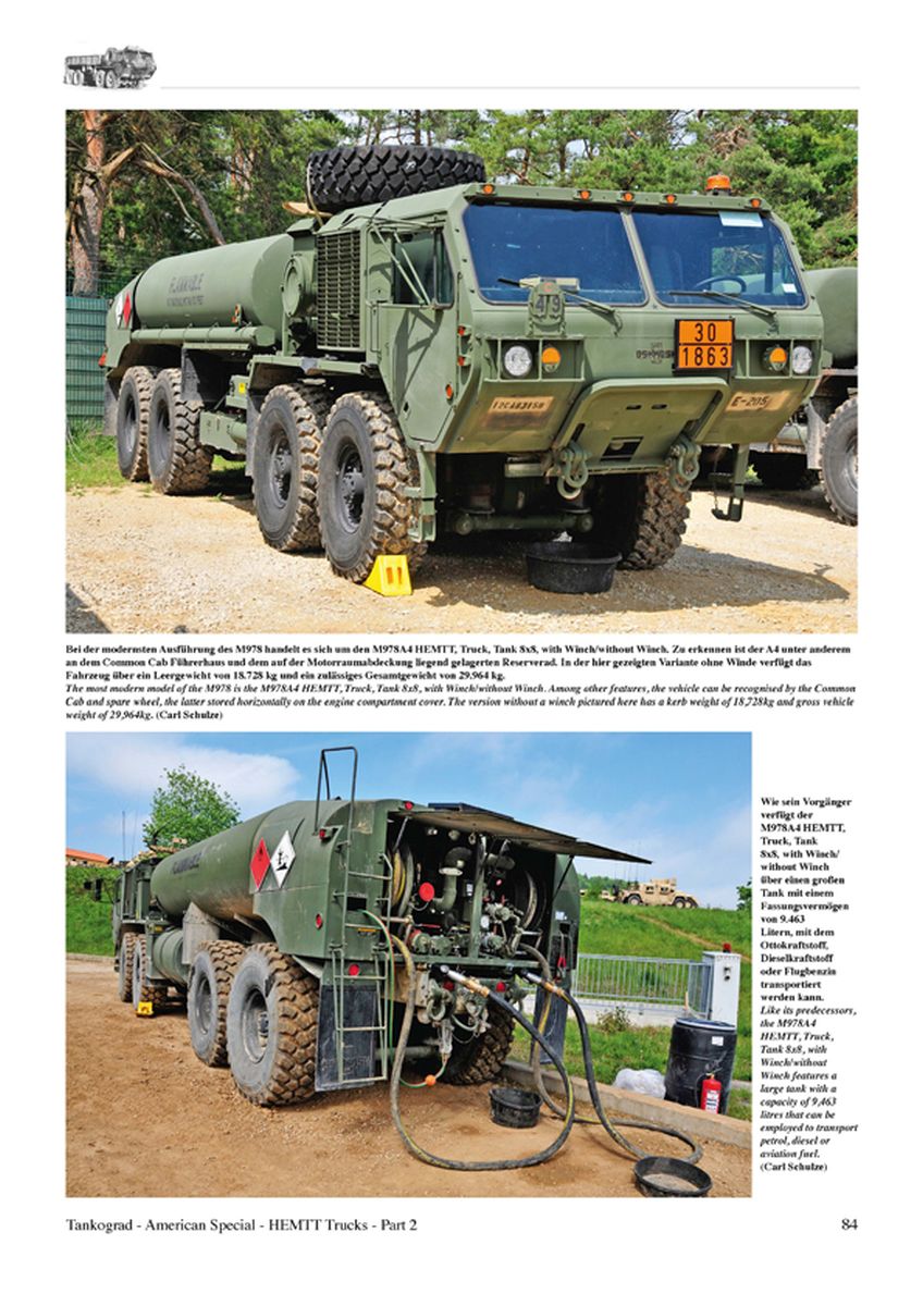Bereits zu Beginn der American Specials Serie veröffentlichte Tankograd 2 Hefte über den HEMTT der US Armee unter den Nummern 3003 (nicht mehr erhältlich) und 3004 (gepanzerte Varianten). Nun gibt es endlich als Ersatz für 3003 eine Neuauflage mit gleich zwei American Specials 3035 und 3036. Auf nun 128 Seiten (2x 64) finden wir 256 farbige Gesamt- und Detailfotos der zahlreichen HEMTT Varianten in Tarnbemalungen der US Armee für verschiedenen Einsatzorte und etliche Risszeichnungen. Darunter auch bisher unveröffentlichte Bilder. Die Fotos sind allesamt farbig und gestochen scharf. Der Text wie auch die Bildunterschriften ist, wie bei diesen Heften üblich, 2-sprachig in Deutsch und in Englisch vorhanden. Auch hier wird noch einmal kurz auf das HEMTT Programm eingegangen, gefolgt von einer ausführlichen Liste der Typen. Der Technikteil beschäftigt sich mit dem Fahrzeug selbst und liefert Informationen zu Rahmen, Führerhaus, Motor, Getriebe und Verteilergetriebe, Achsen, Lenkung, Räder und Bereifung, Federung und Bremsanlage, elektrische Anlage, Selbstbergewinde, Zusatzausstattung, A2 und A2R1 Technik, Zusatzpanzerungen, Vehicle Hardening Program, Crew Protection Kit (CPK), CPK Model B, Long Term Armor Strategy (LTAS) und HEMTT A4, A4 Technik und der Lebenserwartung. Folgende Fahrzeuge werden im Bild und textlich beschrieben: