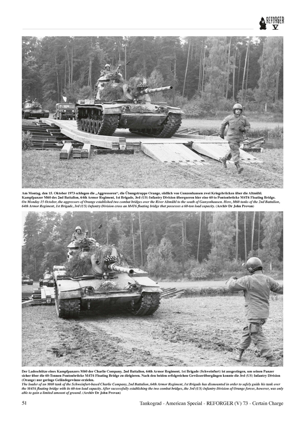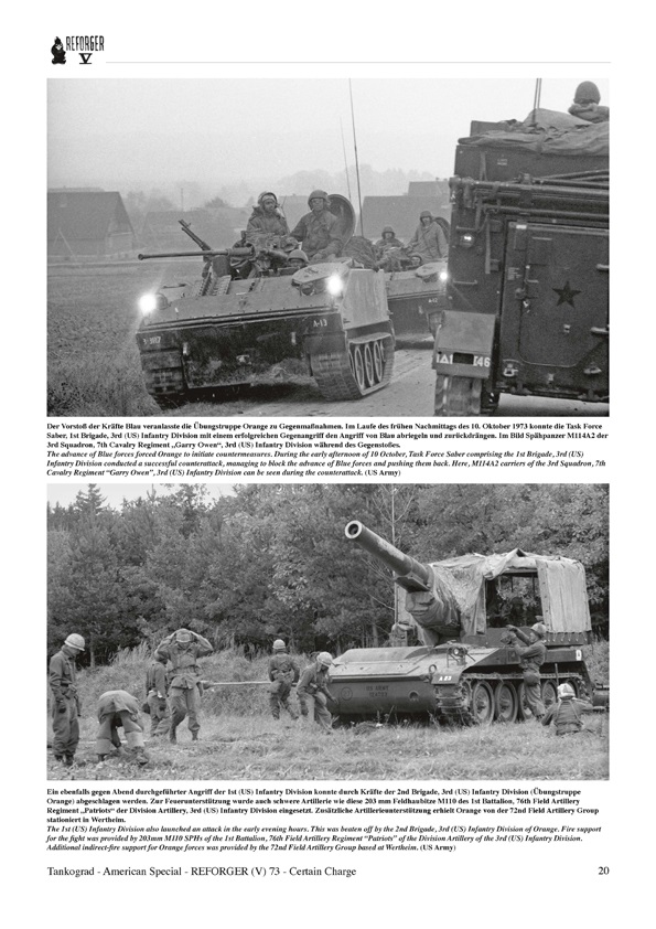 Im Herbst 1973 führte die U.S. Army zwischen dem 29. September und 22. November REFORGER V durch. Die Übung war die fünfte der REFORGER (REturn of FORces to GERmany) Übungsserie, die erste war 1969 durchgeführt worden. Den Kern von REFORGER V bildete die freilaufende Volltruppenübung Field Training Exercise (FTX) Certain Charge die mit insgesamt 51.000 Soldaten aus den U.S.A., Deutschland, Kanada und Frankreich in einem Gebiet südwestlich von Nürnberg stattfand. Der Kontext, in dem REFORGER V durchgeführt wurde, war recht speziell. Nach Abzug der eigenen Truppen aus Vietnam hatte das Engagement der U.S. Streitkräfte geendet. Nach und nach kehrten die Verbände der U.S. Land- und Luftstreitkräfte aus Südostasien zurück und ihr Fokus richtete sich nun wieder auf Europa. Vorliegende Publikation zeichnet in ausdrucksstarken Fotos und mit ausführlichem Text das Manövergeschehen hautnah und sehr detailliert nach. Die ersten zehn Seiten des Heftes befassen sich mit der Einführung in die Übung. Die einzelnen Phasen der Übung, die teilnehmenden Einheiten, die Abläufe und das Fazit werden detailliert vorgestellt. Die Seiten 11 bis 17 widmen sich der Aufmarschphase, ab Seite 18 beginnt dann die Gefechtsphase. Auf den Seiten 44 und 45 finden sich die wohl traurigsten Fotos aus diesem Heft. Ein Jagdbomber F-4E Phantom rammte im Tiefflug einen Mannschaftstransporter M113A1 und stürzte ab. Beide Piloten und zwei Besatzungsmitglieder des M113 starben bei diesem Unglück, ein Landwirt der auf dem Feld in der Nähe arbeitete wurde durch Trümmerteile schwer verletzt. Das muss man sich mal auf der Zunge zergehen lassen… im Tiefflug einen Panzer gerammt. Wahnsinn! Die Fotos sind durchgehend schwarz-weiß, aber von sehr guter Qualität. Ergänzende Bildunterschriften erklären jeweils die gezeigte Szene. Interessant sind dabei die verschiedenen Varianten der Tarnanstriche. Einige Fahrzeuge sind werksseitig im Dreifarb-Anstrich getarnt, viele Fahrzeuge wurden durch die Besatzungen, zum Teil sehr kreativ, mit einer Schlammtarnung versehen. Die Phase der Rückverlegung wird auf den Seiten 62 bis 64 dokumentiert. Insgesamt ein, mal wieder, sehr gelungenes Heft mit tollen Fotos und reichlich Informationen. Die gezeigten Szenen bieten viel Inspiration für die Vignetten- oder Dioramenbauer. Anzahl Fotos und Illustrationen: Durchgehend mit 104 Schwarz/Weiss-Fotos und 5 Grafiken bebildert Text - Sprache: Komplett Deutsch / Englisch Seitenanzahl: 64 Das Heft kann direkt über den Verlag Tankograd bezogen werden. Wir bedanken uns beim Verlag Tankograd, Jochen Vollert, für das Musterheft.