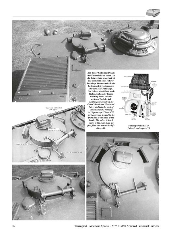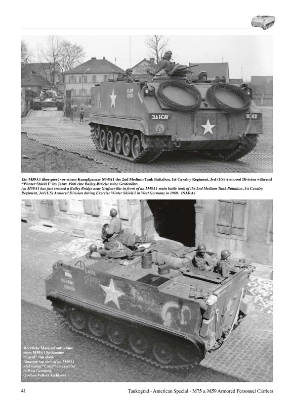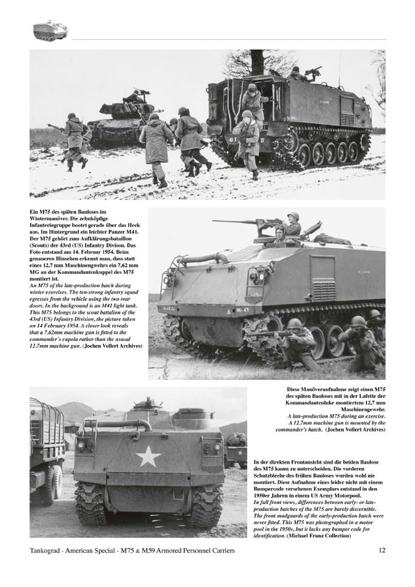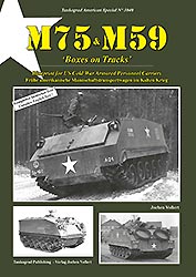 Es entstanden die berühmten „Schachteln auf Ketten“. Beginnend mit dem nur als Prototypen bestehenden gewaltigen M44 wird die Entwicklung zum etwas kleineren M75 beschrieben, ebenso der Einsatz dieser Fahrzeuge und die technischen Daten. Angereichert wird das Ganze mit Fotos aus Vorschriften, von Museumsfahrzeugen und aus dem Truppendienst. Dieser war bei der US Army nicht sehr lang (wenn auch im Koreakrieg recht erfolgreich), denn in der Mitte der 50er Jahre wurden die meisten Fahrzeuge als Militärhilfe an Belgien weitergegeben, wo diese bis in die 80er Jahre ihren Dienst taten. Aber auch von den belgischen Fahrzeugen finden sich einige Einsatzfotos.