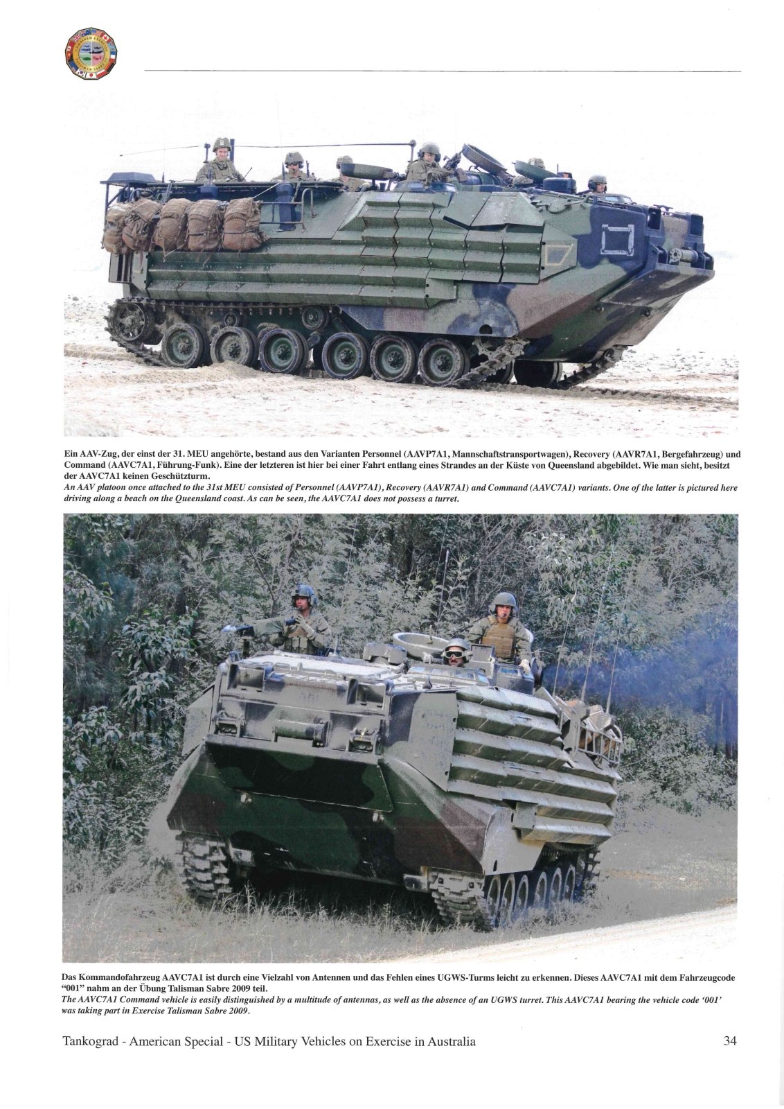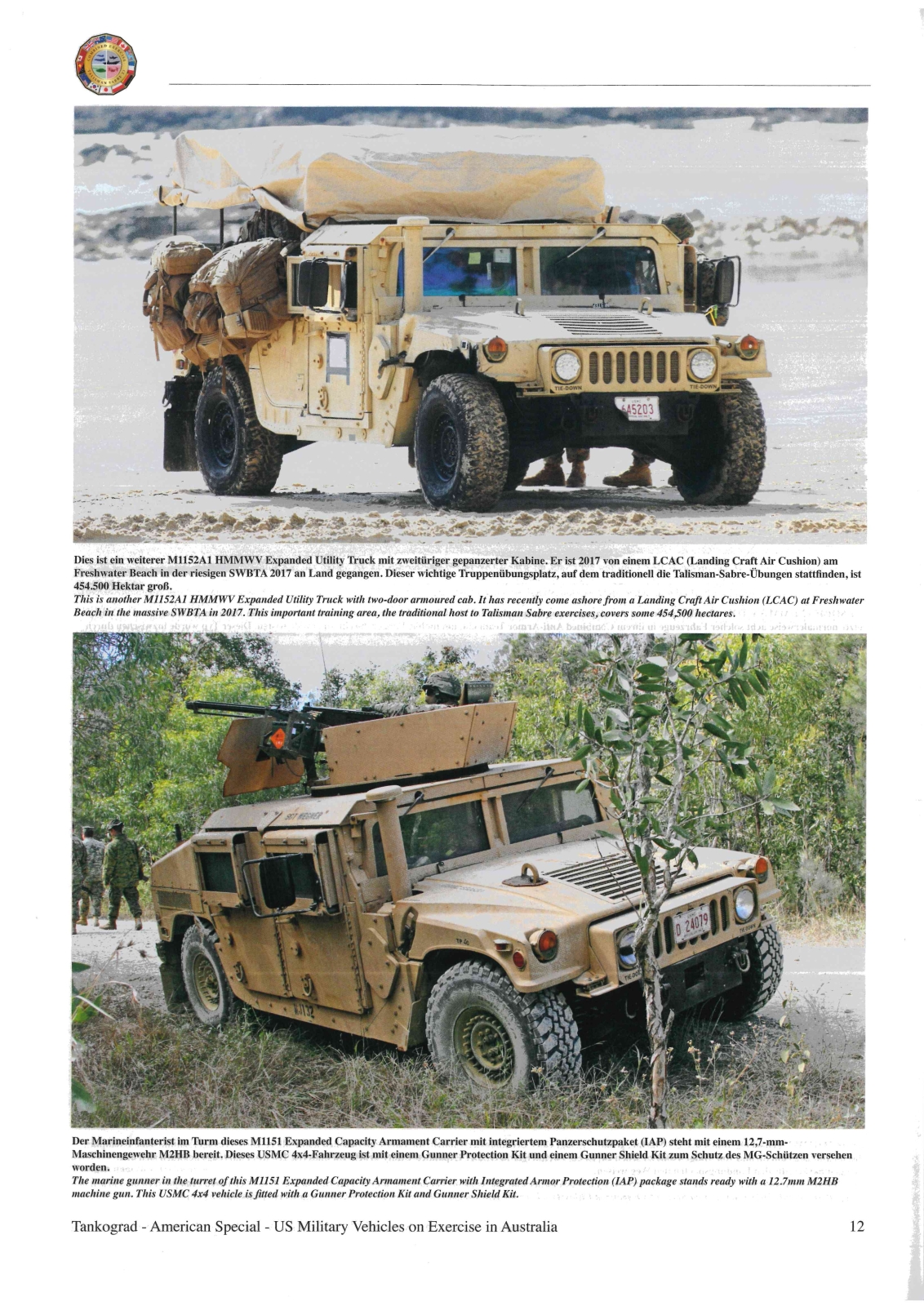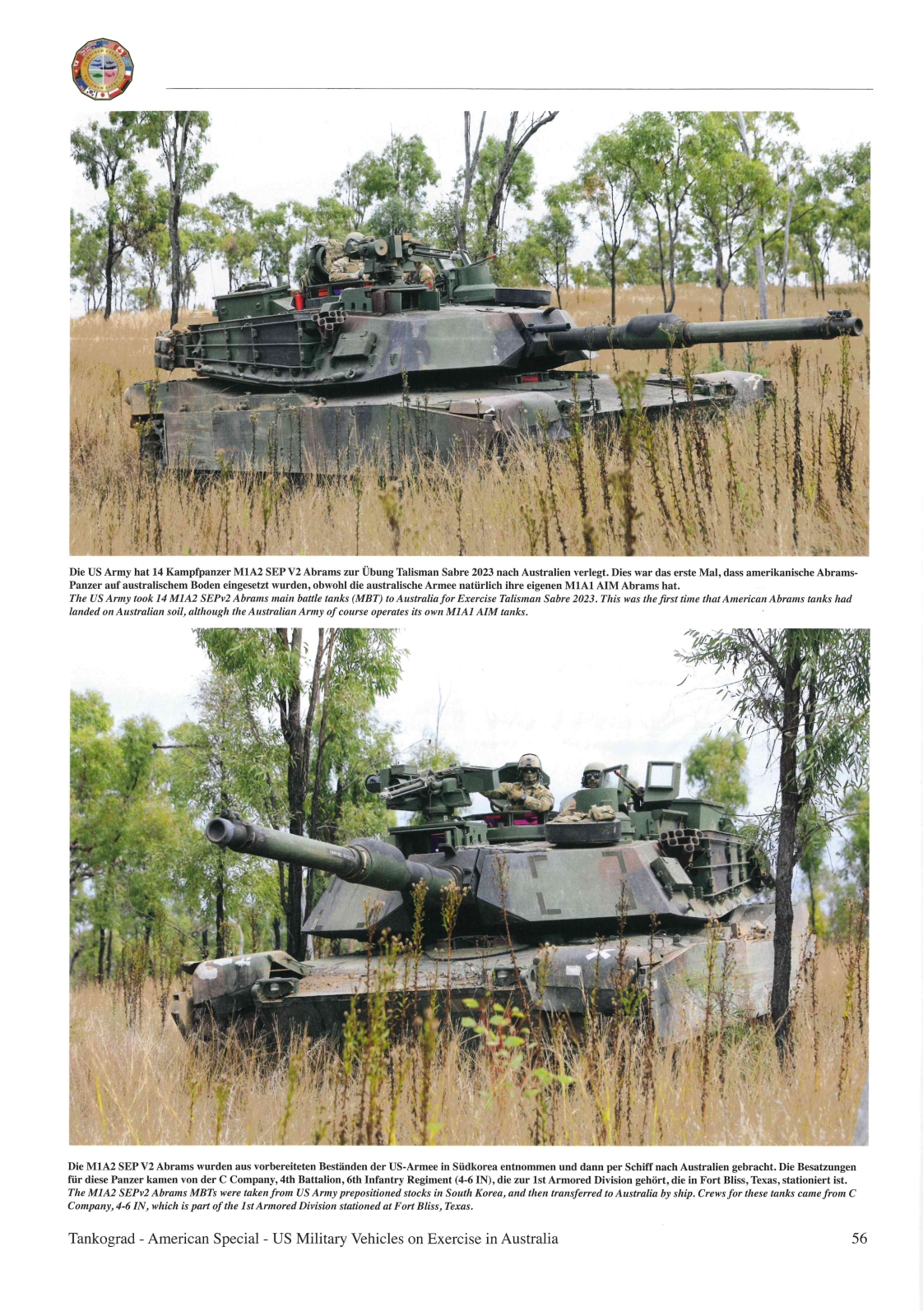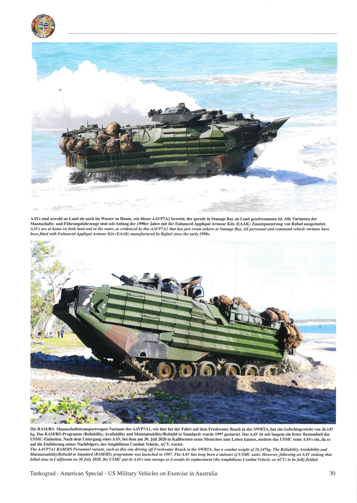 Das Tankograd – Militärfahrzeug Spezial Nr. 3048 beschäftigt sich mit dem Thema „US Military Vehicles on Exercise in Australia“. In bekannter Form wird hier vom Autor Gordon Arthur der Einsatz von verschiedenen amerikanischen Militärfahrfahrzeugen während den Übungen „Talisman Sabre“ auf australischem Gebiet in Wort und Bild gezeigt. Dazu gibt es in dieser Publikation 130 Farb-Fotos verteilt auf 64 Seiten und Texte in deutscher und englischer Sprache. Australien unterhält seit langem enge Verteidigungsbeziehungen zu den USA. Im zweiten Weltkrieg stationierte man ab Dezember 1941 fast eine Million US-Soldaten in Australien und der Oberbefehlshaber der Alliierten Streitkräfte im südwestpazifischen Raum hatte sein Hauptquartier in Brisbane. Diese bilaterale militärische Verbindung wurde in den folgenden Jahren u.a. durch die australische Unterstützung beim globalen Krieg gegen den Terrorismus gestärkt und weiter ausgebaut. Nach dem Ende des Engagements im Irak und in Afghanistan wandten sich beide Länder einer neuen Bedrohung zu. Hier rückte das expansionsorientierte China, mit der massiven Modernisierung ihrer Volksbefreiungsarmee und dem aggressiven Auftreten im pazifischen Raum in den Fokus. Um gegen diese Expansionspolitik Stärke zu zeigen und Abläufe für Gegenmaßnahmen zu trainieren, finden alle 2 Jahre auf australischem Boden, sowie angrenzenden Gewässern und im Luftraum Übungen unter Beteiligung von australischen und amerikanischen Einheiten statt. Diese Übungen laufen seit 2005 unter dem Namen „Talisman Sabre“. Hierbei wird speziell die Verlegung und die Logistik von großen Mengen Fahrzeugen und Soldaten aus US-Depots in das Manövergebiet geübt und deren Einsatz u.a. während amphibischen Landungsoperationen in Zusammenwirken mit australischen Einheiten trainiert. Waren bei der ersten Übung schon rund 16.000 Soldaten beider Nationen beteiligt, entwickelte sich die Übung in den kommenden Jahren immer mehr zu einer multilateralen Veranstaltung. Zuletzt waren im August 2023 ca. 34.500 Soldaten aus insgesamt 13 Nationen beteiligt. Über die Jahre änderte sich die Art des Manövers, die Komplexität und der Umfang wuchsen. Dabei war gut die Modernisierung der Fahrzeugflotten zu beobachten. Das Heft beginnt mit einem 4-seitigen Textteil, in dem der Hintergrund und die weitere Entwicklung der Talisman-Sabre-Übungen erläutert wird. Die Ausführungen gliedern sich in: - Talisman-Sabre-Übungen - Logistik - Amphibische Operationen Danach folgt der eigentliche Bildteil dieser Publikation. Dieser gliedert sich wiederrum in folgende Kapitel: - US-Marine Corps Vehicles on Talisman Sabre Exercises (35 Seiten) - US Army Vehicles on Talisman Sabre Exercises (19 Seiten) - US Helicopters on Talisman Sabre Exercises (6 Seiten) Hier werden u. a. folgende Fahrzeuge während des Übungseinsatzes gezeigt: Oshkosh MTVR-Lkw in verschiedenen Versionen, Joint Light Tactical Vehicle (JLTV), Utility Task Vehicle (UTV) Polaris MRZR D4 4x4, Internally Transportable Vehicle (ITV) M1163, ITV M1161, Interim Fast Attack Vehicle (IFAV), HMMWV in verschiedenen Versionen, LARC-V, Landungsboot LCU, Hovercraft LCAC, Haubitze M577 A2, M142 HIMARS, Amphibischer Sturmpanzer AAVP7 A1 in verschiedenen Versionen, Light Armored Vehicle (LAV) in verschiedenen Versionen, FMTV-Lkw in verschiedenen Versionen, Oshkosh HEMTT-Lkw in verschiedenen Versionen, Kampfpanzer M1 A2 Abrams, Hubschrauber UH-60 Black Hawk, Apache Kampfhubschrauber, Sikorsky CH-53 E Super Stallion, Bell-Boing MV-22B Osprey, Fazit: Ein interessanter Band aus dieser Reihe von Tankograd, der dem geneigten Leser und Modellbauer aktuelle US-Fahrzeuge auf australischen Boden kurz und knapp und doch ausführlich genug mit aussagekräftigen Fotos und Text näher bringt. Das Heft kann zum Preis von EUR 18,95 (zzgl. Versandkosten) direkt beim Verlag bestellt werden. Wir bedanken uns beim Verlag Tankograd, Jochen Vollert, für das Musterheft.