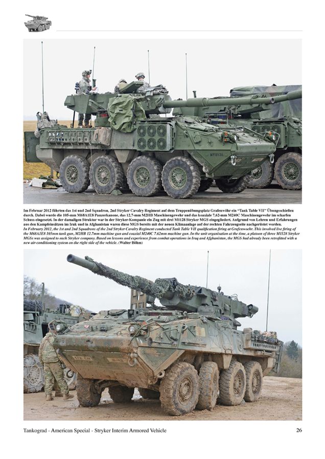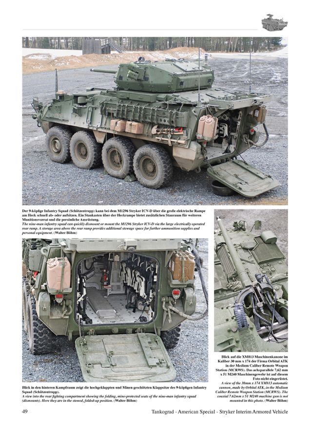Autor: Walter Böhm 64 Seiten (+4) mit 105 Farb-Fotos Heute kann ich Euch ein interessantes Heft von Tankograd Publishing vorstellen, das sich gleich mit einer ganzen Fahrzeugfamilie beschäftigt - der des 8-rädrigen IAV Stryker. Die Geschichte der Familie wird im 8-seitigen Textteil abgedeckt. Man erfährt etwas, welche Lücke der Stryker füllt und welchen Einfluss er auf die Bildung von Einheiten in der U.S. Armee hat. Folgende Abschnitte bieten diese Informationen an: STRYKER Interim Armoured Vehicle o Der Weg zum Stryker Brigade Combat Team (SBCT) Enthalten ist eine Liste vom M1126 bis zum M1135 inklusive kampfwertgesteigerten Fahrzeugen und eine ganze Seite mit technischen Daten. Der Bildteil arbeitet die Fahrzeugliste immer mit einer kurzen Einführung zum beschriebenen Fahrzeug und einem mehrseitigem Bildteil ab. Auch die Bildbeschreibungen sparen nicht mit Informationen. Folgende Fahrzeuge bzw. Systeme werden vorgestellt: · M1126 ICV Infantry Carrier Vehicle Anhand der Liste kann man erkennen, wie umfangreich die Stryker-Familie ist und welche Bereiche, von der Infanterieunterstützung über Panzerabwehr, Führung bis zur Flugabwehr sie abdecken kann. Die großformatigen, gestochen scharfen zeigen die Fahrzeuge an verschiedenen Einsatz-/Übungsorten und spart auch nicht mit Nahaufnahmen und Einblicken.