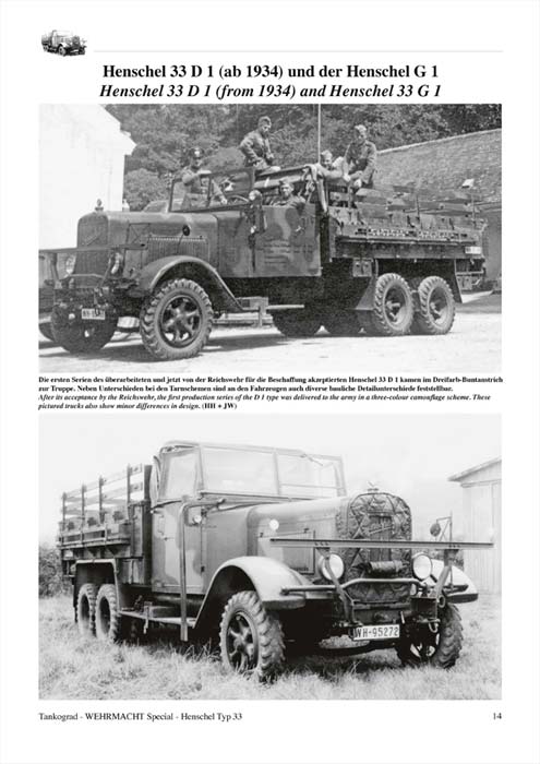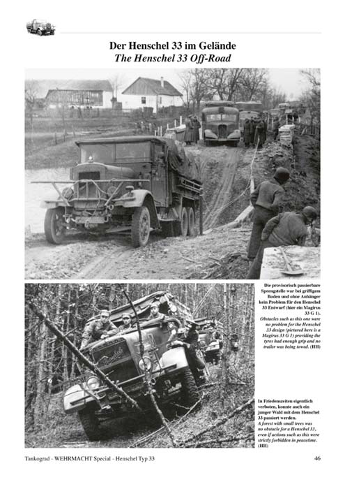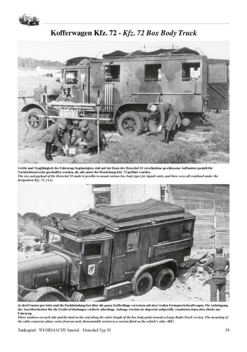 Gezeigt werden hier die frühen Formen des Henschel 33 (B1 und D1), Henschel 33 ab 1934 (D1 und G1), Küchenwagen, Flak-Kraftwagen, Scheinwerfer Kraftwagen, Kabel Kraftwagen, Pionierkraftwagen, geschlossene Aufbauten, Werkstatt Kraftwagen, Kofferwagen Kfz.72, Tankkraftspritze Kfz.343. Besonders ist der Lizenzbau des Henschel 33 durch Magirus, der auch hier dargestellt wird. Desweiteren gibt es den Henschel 33 im Gelände zu sehen - für Modell- und Dioramenbauer sehr hilfreich. Dazu Pflege- und Wartung, sowie Unfälle und Gefechtsschäden.