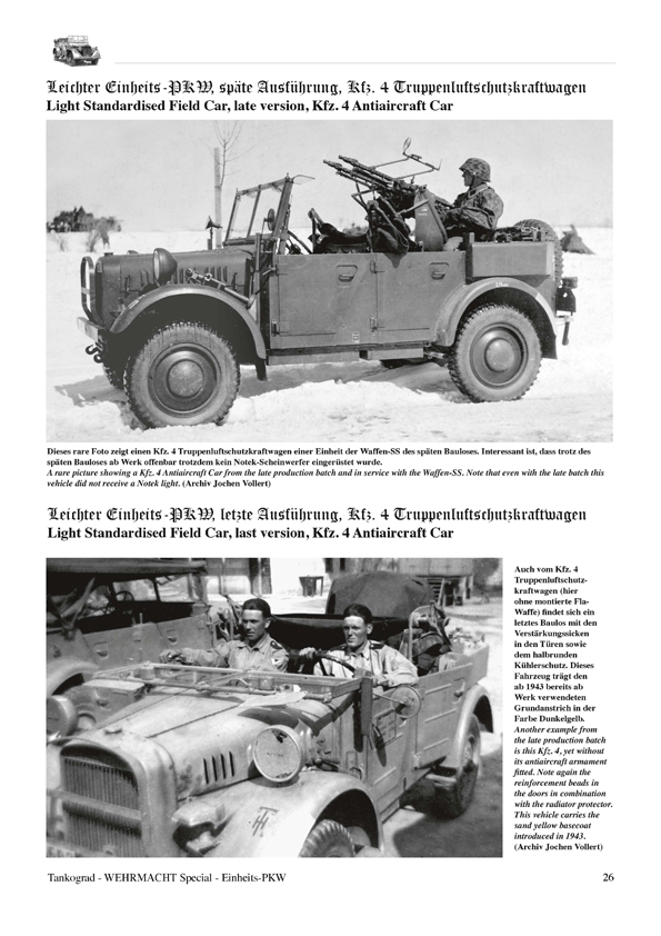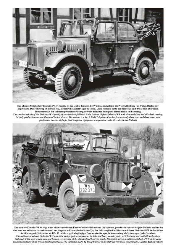 Man bekommt die Fahrzeuge mit offenem oder geschlossenem Aufbau zu sehen, mit offenem oder geschlossenem Verdeck. Es werden Einblicke ins Fahrzeuginnere und in den Kofferraum gewährt. Man sieht, wie eng die Soldaten im Mannschaftskraftwagen saßen, wie gemütlich im Vergleich es die Kommandeure hatten. Auch die unterschiedlichen Rüstzustände sind interessant. Alle Fotos sind wie immer mit ausführlichen Bildbeschreibungen ausgestattet.
