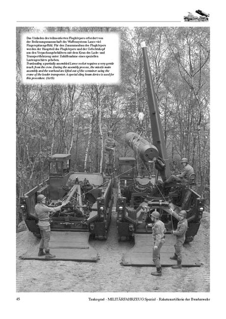Mit 14 Seiten wird dann das LANCE System abgehandelt, wobei allein 4 Seiten der Entwicklungsgeschichte, technischen Beschreibung und dem Einsatz in der truppe textlich gewidmet sind. Beschrieben wird natürlich neben dem Startsystem auch das Ladefahrzeug und der Abschussanhänger. Diese sind in den folgenden Fotos ebenfalls mit dargestellt.