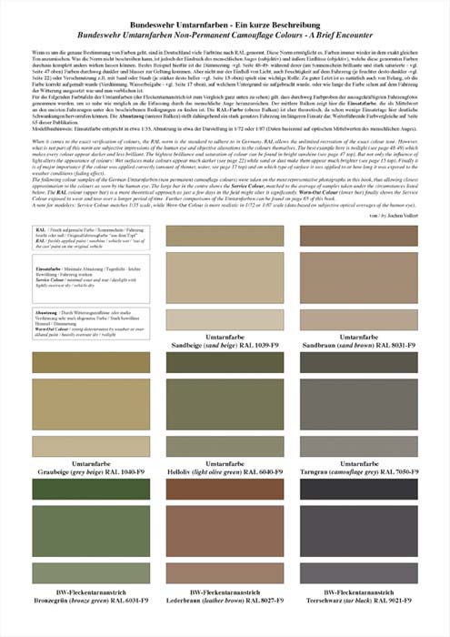 Der Modellbaurelevante Kracher kommt sofort auf der Innenseite der Frontseite - nämlich eine Farbübersicht der eingesetzten Farben, sowohl mit RAL Farbton (ja, richtig gelesen - die Umtarnfarben haben seit Neuestem RAL Zuordnungen) sowohl in Abnutzung bzw. Darstellung im Modellbaumaßstab.