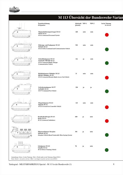 Aber schon nach 7 Seiten geht es ans Eingemachte, denn dann geht es um die deutschen M113, die ab 1962 eingeführt wurden und welche Bataillone wann M113 erhalten haben. Besonders schön ist die Übersicht aller M113 varianten, die in der Bw je Dienst taten mit einer kleinen zeichnung, der Bezeichnung, der Stückzahl, sowie der Angabe ob und wenn ja welche NDV durchgeführt wurde und ob aktuell noch in der Nutzung!