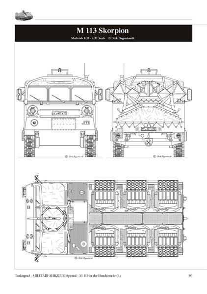 Es folgen dann 12 Seiten zum Minenwurfsystem Skorpion, das auch wieder mit sehr guten 1:35 Maßstabszeichnungen gezeigt wird.