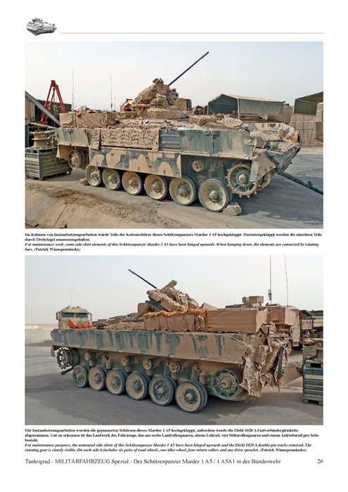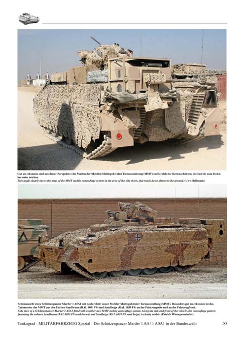 Es folgen 3 Seiten Text zum aufgemotzten Marder 1 A5A1 inklusive einer großen Tabelle technischer Daten. Daran schließen sich 13 Seiten mit Fotos zu dieser Marder version an - diese zeigen ihn hauptsächlich im Afghanistan Einsatz mit MMT und Klimagerät, sowie diversen kleineren Umrüstungen im Einsatz. Weitere 6 Seiten zeigen dann Detailaufnahmen der verschiedenen Komponenten der A5A1 Version.