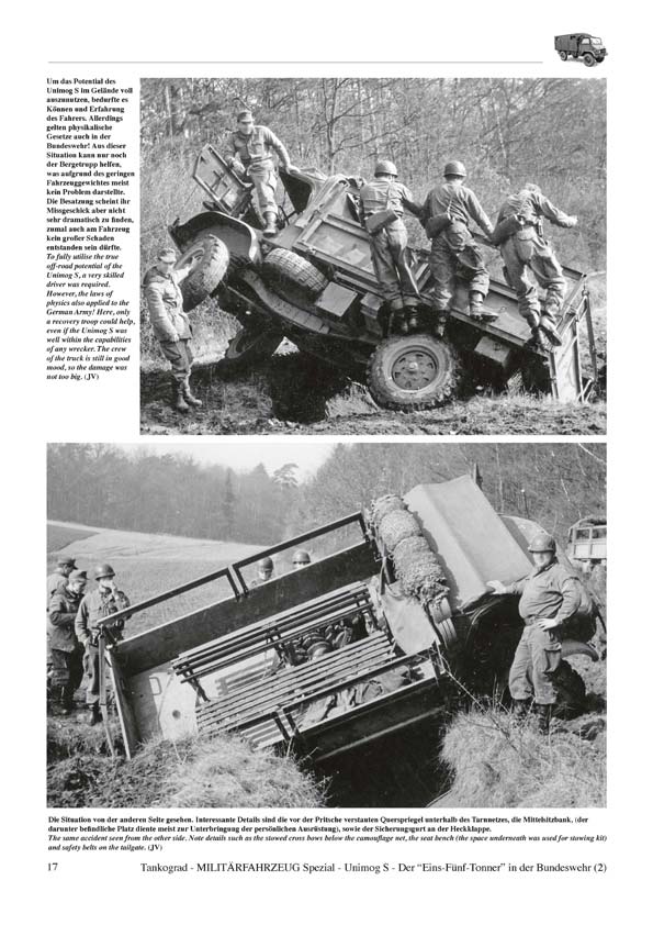 Das Heft strotzt nur so von tollen Fotos des Unimog S mit Plane/Pritsche in allen Lebenslagen, sei es auf dem Kasernenhof, im Gelände, auf Verladung oder im Manöver (spannende Fotos hier wie etwa ein Unimog als Zugmittel des 90mm Pak Prototyps). Ein großer Teil der Fotos sind noch in schwarzweiß aber in beeindruckend guter Qualität.