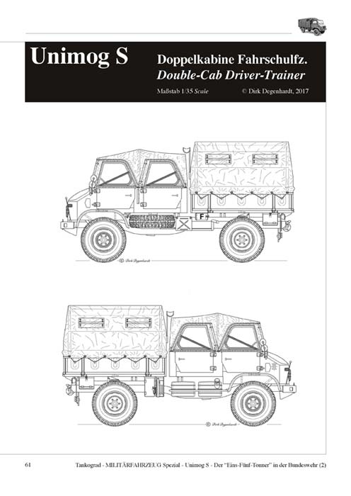 Zusätzlich gibt es mehrere Mehrseiten-Maßstabszeichnungen des Unimogs und auch eine kleinere Ãbersicht eines Flecktarnplans in schwarzweiß zur Aufbringung des Nato Dreifarb Flecktarnanstrichs nach der Nutzung von gelboliv als Grundfarbe.