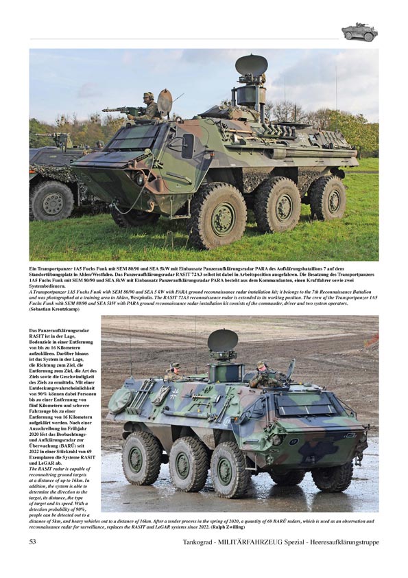 Heeresaufklärungstruppe - Heute Das heutige AUSGEPACKT beschäftigt sich in einer Truppengattung die man gar nicht immer so auf dem Schirm hat und deren Fahrzeugbestand sich seiten den Zeiten des Spähpanzer Luchs ziemlich gewandelt hat. Das Heft beginnt mit 14 Seiten Text über die Entwicklung, Stand der Dinge und Ausblick der Aufklärungstruppe und geht textlich kurz auf alle Teilbereiche ein. Desweiteren werden die Verbände und Einheiten dieser Truppengattung genauer vorgestellt. Danach wird den Rest des Heftes Waffen, Fahrzeuge und Systeme in Fotos und entsprechenden Bildunterschriften mit etwa 2 pro Seite gezeigt. Der Preis beträgt in Deutschland EUR 18,95 (zzgl. Versandkosten) direkt ab Verlag.