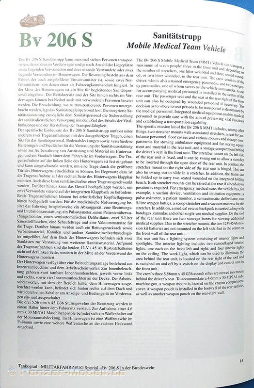 Das Heft beginnt mit einer kurzen Einführung über den BV206S in der Bundeswehr. Danach geht es in die technische Beschreibung, in der die einzelnen Bereiche und Komponenten gezeigt und textlich beschrieben werden.