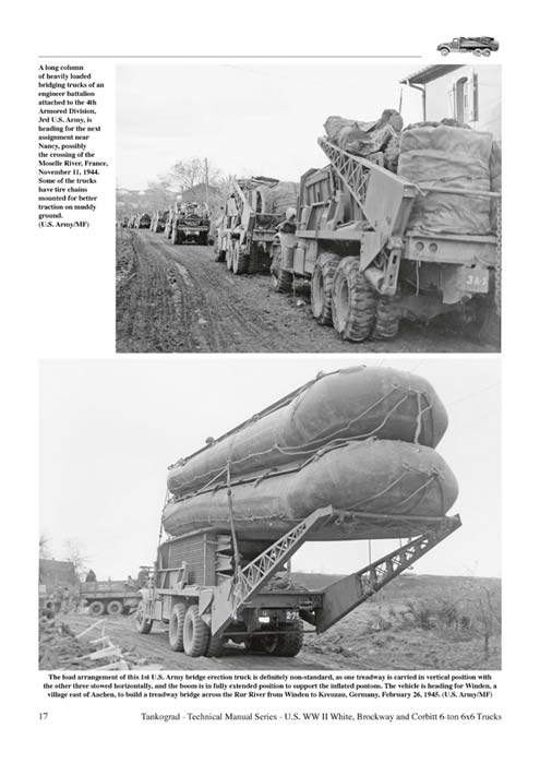 Dabei wird wie gewohnt eine sehr ausgeglichene Mischung aus Einsatzfotos und Auszügen aus den jeweiligen technischen Dienstvorschriften geliefert, welche grad dem Modellbauer bei der Detaillierung oder der Ideenfindung fürs Diorama helfen. Kleines Highlight aus der Rubrik „kennt-keiner-ist-aber-cool“ ist der M32 TRV Bridge Layer. Und auch hier sind genug Zeichnungen und Fotos vorhanden um gleich mit dem Scrach-Projekt zu beginnenEs wird auf die drei LKW Hersteller und die Abarten der jeweiligen 6x6 Trucks eingegangen, sowohl in einem einleitenden Text zur Entwicklung als auch in ausführlichen Bilduterschriften zu den einzelnen versionen.