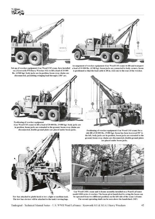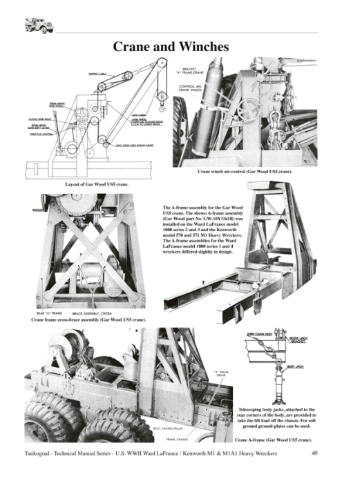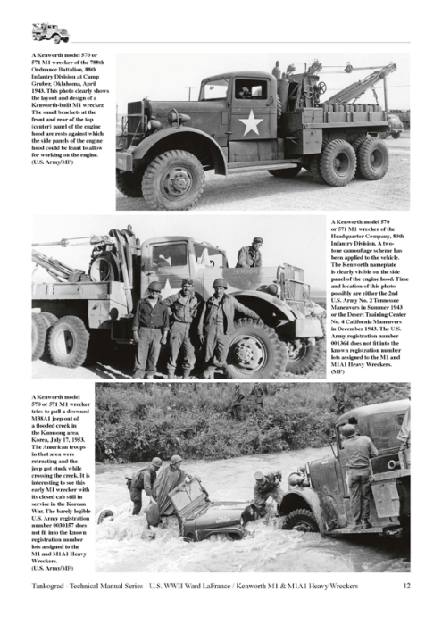Autor: Michael Franz 48 Seiten (+3) mit 3 Farbphotos und über 150 schwarz-weiß Photos, Skizzen, Zeichnungen Das ist das erste Mal, dass ich ein Heft aus der Technical Manuals Serie von Tankograd Publishing in den Händen halte. Der Umschlag erinnert mich an die Technischen Dienstvorschriften, wie ich sie aus meiner Bundeswehrzeit kenne. Der Inhalt aber ist eine Mischung aus Einsatzphotos, Bedienungsanleitung und technischen Erklärungen mit englischem Text. Im 2.Weltkrieg teilte die US Armee ihre Berge-Lkws in 3 Gruppen - leicht, mittel und schwer. Während die leichten Bergefahrzeuge auf dem GMC CCKW-353, die mittleren auf dem Diamond T-969, basierten die schweren auf dem Ward LaFrance, bzw. Kenworth M1. Der Textteil kommt diesmal mit 3 Seiten aus und gibt zuerst kurze Informationen über die beiden Hersteller Ward LaFrance und Kenworth. Diesen folgt die Geschichte und in einem weiteren Abschnitt die Beschreibung der Fahrzeuge. Weitere Teile widmen sich den Unterschieden zwischen den Modellen und den U.S. Armee Registrierungsnummern. Die technischen Daten und die Produktionszahlen schließen den rein schriftlichen Teil. Die einzigen 3 Farbfotos aus dem Einsatz in Korea findet man auf den Innenseiten des Umschlages. Der Rest des Fototeils besteht aus einer Mischung von Illustrationen mit Benennungen von Bauteilen, Einsatzaufnahmen und schematischen Skizzen (z.B. Antrieb, Bremssystem). Dazu kommen immer wieder Detailaufnahmen von Baugruppen und Bedienelementen. Die Einsatzfotos lassen fast keine Situation aus. Sei es der Windeneinsatz unter Nutzung verschiedener Abstützungen und/oder Erdanker, die Bedienung und Nutzung des Kranes bei verschiedenen Gewichten mit und ohne Zusatzabstützung oder das simple Schleppen eines Fahrzeuges. Interessant fand ich auch die Einblicke in verschiedene Stau- und Werkzeugkästen, die klar erkennen lassen, welches Werkzeug (Schraubenschlüssel, Nüsse, Hammer, Seile, Schläuche etc) mitgeführt wurde. Extra-Abschnitte behandeln: