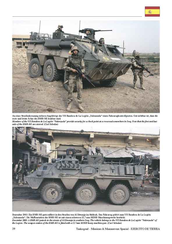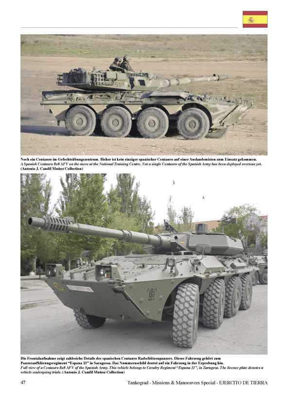 Nach einer äußerst umfangreichen und informativen Einleitung mit Angaben zur Gliederung, Kapazitäten und Einsätzen folgen zunächst reichlich Informationen zu den verwendeten ungepanzerten Fahrzeugen, wie z. B. dem Nissan 4x4 Patrol. Weiter geht es dann mit der Artillerie und der Flugabwehr. Gepanzerte Radfahrzeuge wie der BMR-11 und Centauro werden ebenso vorgestellt wie auch die im Einsatz befindlichen Kettenfahrzeuge, z. B. der Schützenpanzer Pizarro, M113, Leopard 2A4 und natürlich auch der Leopard 2A6E.