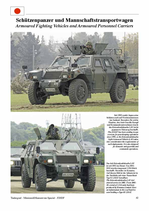 Modellbauerisch ist dieses Heft sicherlich auch sehr interessant da sich Tamiya , wenn auch nur mit wenigen Militärfahrzeugen in 1:35, auch diesem Thema gewidmet hat und beispielsweise den Typ 74, den Typ90 und den LAV der JGSDF als Bausatz anbietet