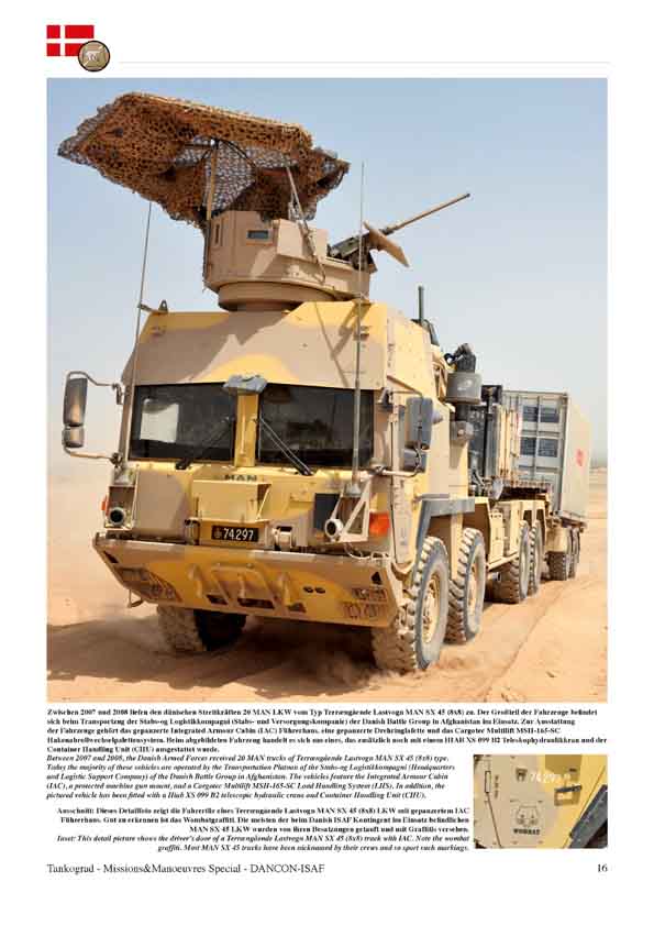 Besonders interessant ist hierbei die Vielfalt der Tarnanstriche. Vom grün-schwarzen Standardanstrich der dänischen Streitkräfte wird Bildmaterial mit einfarbig sandfarbener Tarnung, sandfarbener Fleckentarnung mit zwei und drei Tarnfarben sowie zwei Fotos eines Lkw MAN HX77 geboten. Dieser Lkw trägt eine besonders eigenwillige sandfarbene Tarnung mit rotbraunen Streifen. Diesen sehr ungewöhnlichen Anstrich hat wohl die Besatzung selbst mit viel künstlerischer Aktivität und Freiheit gestaltet.