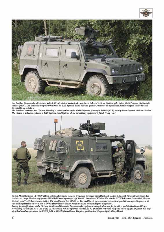 Das britische Armoured Reconnaissance Regiment (Panzeraufklärungsbataillon) führt im Rahmen des Großverbandes weiträumige, bodengebundene, bemannte Aufklärung durch. Mit dieser Publikation soll dem interessierten Leser ein Einblick in das Konzept, die Struktur und in die Fahrzeugausstattung im Grundbetrieb wie auch im Einsatz des Formation Reconnaissance Regiments 1st The Queen´s Dragoon Guards (QDG) und angebundener Aufklärungseinheiten geboten werden. Nach ausführlichen Hintergrundinformationen und einem geschichtlichen Abriss über die britischen Panzeraufklärer folgt erstklassiges Bildmaterial. Etliche Fotos zeigen die Fahrzeuge während einer Übung und bieten so tolles Referenzmaterial. Die Anbringung von natürlichem und künstlichem Tarnmaterial sowie die Verstauung von Ausrüstung am Fahrzeug wird hier auf vielen Fotos gut gezeigt und dürfte dem Modellbauer reichhaltiges Vorlagenmaterial bieten. Alle Fotos sind mit umfangreichen Bildunterschriften versehen, welche nicht nur das gezeigte Fahrzeug kommentieren, sondern in vielen Fällen auch taktische Hinweise zur gezeigten Szene geben. Den Schwerpunkt bilden verschiedene Panzer aus der CVR- Reihe wie z. B. Spartan, Scimitar, Samson, Sultan, Samaritan usw. Aber auch der Landrover, die Harley Davidson MT-500 sowie verschiedene Lkw werden gezeigt. Da es von Accurate Armor ein umfangreiches Programm dieser Fahrzeuge im Modell gibt dürfte der interessierte Modellbauer hier reichlich Vorlagenmaterial finden.