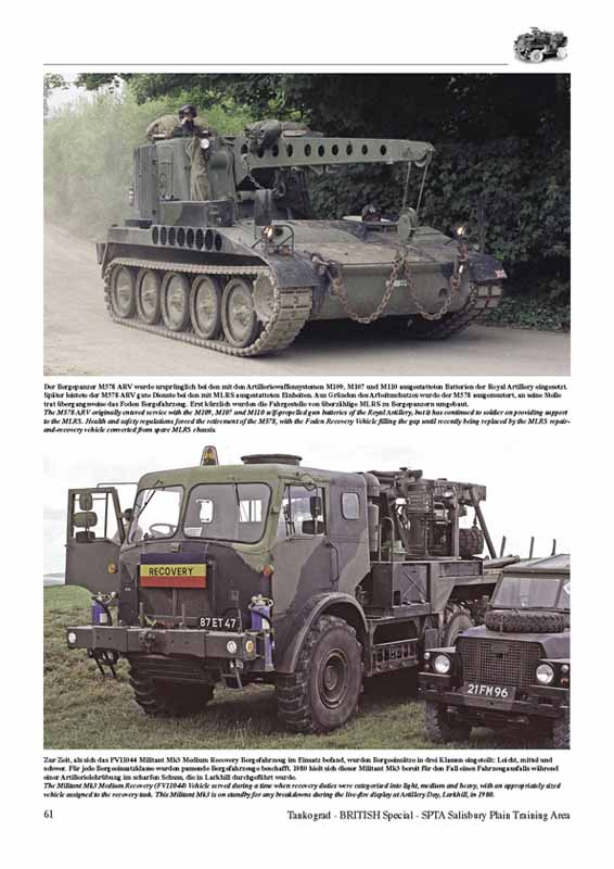 SALISBURY PLAIN TRAINING AREA Beim Truppenübungsplatz Salisbury Plain Training Area (SPTA) handelt es sich um den größten Truppenübungsplatz in Großbritannien. Das ganze Jahr über werden hier Scharfschieß- und Gefechtsübungen durchgeführt. Der Truppenübungsplatz hat in den letzten 100 Jahren eine wichtige Rolle bei der Weiterentwicklung und Ausbildung der britischen Streitkräfte gespielt. Diese Publikation erzählt die Geschichte von SPTA und zeigt im Bildteil ausgesuchte seltene Farbfotos von Fahrzeugen der britischen Armee im Einsatz vor Ort von den 1970er Jahren bis Heute. Lassen Sie sich entführen in eine Zeit als Chieftains, Stalwarts, Militants, Nubians und Saxons, um nur einige zu nennen, das südliche England beherrschten! Nach einem umfangreichen historischen Rückblick auf diesen Truppenübungsplatz, seine Entstehung, Nutzung und Modernisierung werden die einzelnen Waffengattungen während der Ausbildung auf dem Salisbury Plain Training Area in Wort und Bild vorgestellt. Beginnend mit der Panzertruppe sind schöne Bilder vom Chieftain sowie Challenger 1 und 2 zu sehen. Weitere Kapitel befassen sich dann mit Light Armour, Artillery, Engineers, Infantry, Logistics und abschließend mit der Instandsetzungstruppe, der REME. Insgesamt finden sich hier neben umfangreichen Informationen Fotos von Fahrzeugen aus 70er und 80er Jahren bis hin zu ganz aktuellen Bildern von 2008 auf denen der Brückenlegepanzer Titan und der Pionierpanzer Trojan im Arbeitseinsatz zu sehen sind. Anzahl Fotos und Illustrationen: durchgehend mit 132 Farbfotos bebildert Dieses tolle und sehr informative Heft bietet dem Modellbauer umfangreiche Vorlagen für den Modell- und Dioramenbau kann direkt beim Verlag für 14,95 EUR bezogen werden.