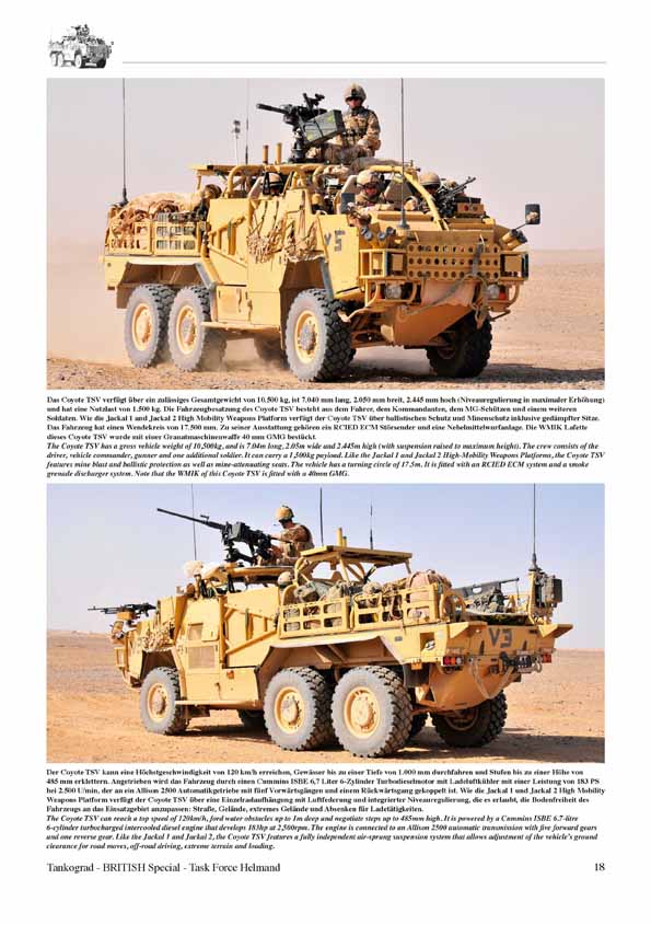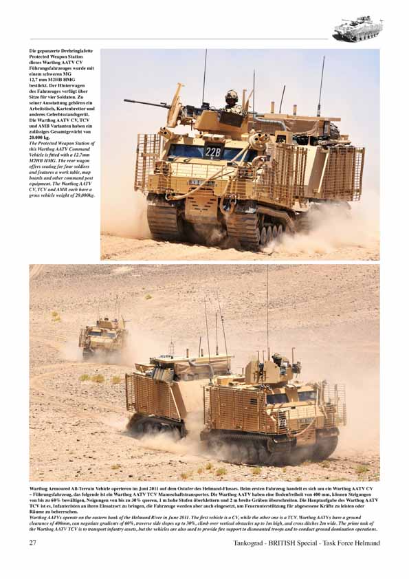 Britische Truppen befinden sich seit 2006 im Rahmen von ISAF in Südafghanistan im Einsatz. Ihr Auftrag ist es, in der Provinz Helmand die afghanische Regierung bei der Schaffung einer stabilen Sicherheitslage zu unterstützen, bei der Ausbildung afghanischer Sicherheitskräfte zu helfen und den Wiederaufbau des Landes zu fördern. Das Heft gliedert sich in folgende Themenbereiche: Leichte Radfahrzeuge: Hier werden beispielsweise das Yamaha Grizzly 450 IRS Quad, das Springer FOB Retrieval Vehicle und natürlich auch der Landrover vorgestellt. Geschützte Fahrzeuge: Jackal 1 und 2, Coyote, Panther CLV, Husky und weitere gepanzerte Radfahrzeuge werden in diesem Abschnitt mit tollem Bildmaterial vorgestellt. Späh- und Schützenpanzer: Natürlich dürfen auch die echten Klassiker nicht fehlen. Scimitar, Spartan, Sultan, Samson und der Warrior werden in diesem Heftabschnitt vorgestellt. Lastkraftwagen: Die Lkw von DAF, MAN, Leyland und Oshkosh bilden das Rückgrat im Transport- und Logistikwesen der britischen Armee und werden in vielen Varianten und Abarten gezeigt. Pioniergerät: Verschiedene Lkw, Brückentransporter, Radlader, der Buffalo, Landrover und der Pionierpanzer Trojan werden im Arbeitseinsatz mit spektakulärem Bild- und Textmaterial präsentiert. Abschließend folgen noch kurze Abrisse von Feldumschlaggeräten, Artilleriesystemen und Hubschraubern. Insgesamt ein sehr umfangreiches und informatives Heft in dem der Fuhrpark der Task Force Helmand vorgestellt wird. Anzahl Fotos und Illustrationen:Durchgehend mit 130 Farbfotos bebildert Das Heft kann zum Preis von 14,95 EUR direkt über den Verlag bezogen werden.