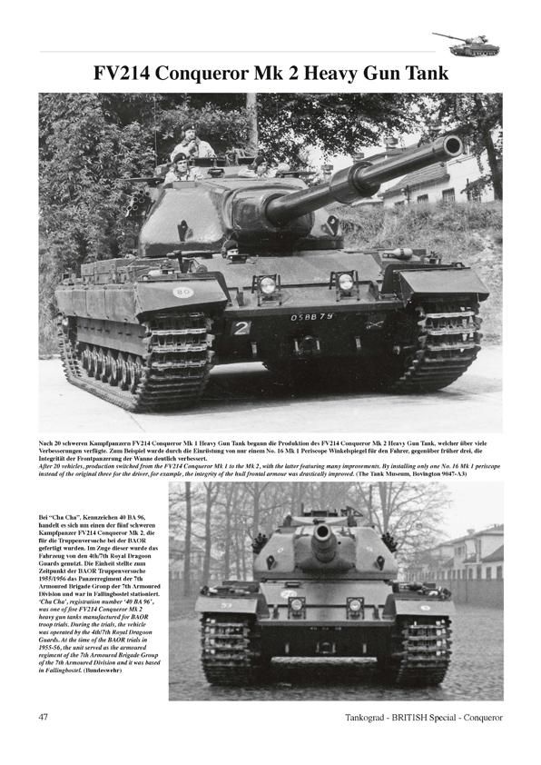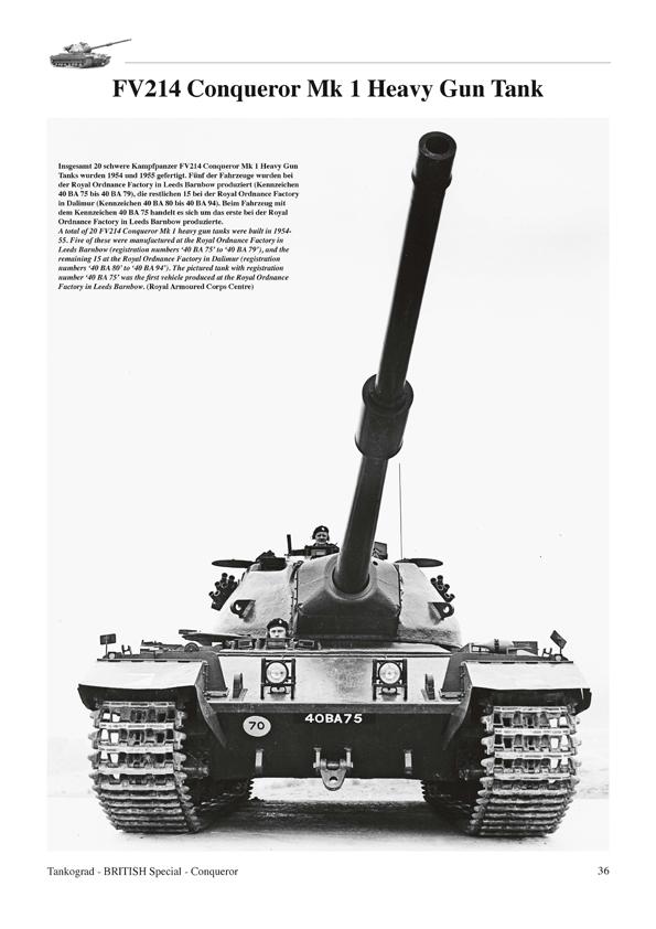 Autor: Carl Schulze Meine erste Begegnung mit dem FV 214 Conqueror fand 1981 beim Panzerschießtraining im Merrion Camp, Castlemartin (Wales) statt. Damals hielt ich ihn für einen Prototypen, bzw. Überbleibsel aus dem 2. Weltkrieg und habe mich nicht mehr damit beschäftigt. Das Interesse flammte wieder auf, als er dieses Jahr als Plastikmodelbausatz auf den Markt kam. Tankograd nimmt den Ball auf und fasst in seinem British Special Informationen und Bilder zusammen. Dem ausführlichen deutsch/englischen Textteil entnehmen wir, warum und wie es zur Entwicklung dieses schweren Panzers kam. Man erfährt von den Vorgängern/Übergangsprojekten wie dem FV221 Caernarvon und dem FV4004 Convay, von Truppenversuchen, technischer Ausrüstung (Wanne, Motor und Getriebe, Laufwerk, Bewaffnung etc.), der Serienproduktion und dem mit 8 Jahren recht kurzen Truppendienst. Auch seine ARV- und Pionier Brüder werden angesprochen. Der aus hauptsächlich Schwarz-Weiß Aufnahmen (den damaligen Umständen geschuldet) bestehende Bildteil startet mit einem Foto eines IS-3, der der Auslöser der Conqueror Entwicklung war. Die folgende Bilderflut ist in folgende Abschnitte aufgeteilt: · FV201 Universal Tank Alle Fotos sind mit ausführlichen Bildbeschreibungen versehen. Besonders interessant finde ich die Einsatzfotos und die Auszüge aus der Dienstvorschrift. Wenn es sich auch meist um Aufnahmen in der Totalen handelt, sind durch die Großformatigkeit und die Bildschärfe viele Details deutlich zu erkennen. Wer einen Conqueror im Modell bauen möchte oder sich für die Monster des „Kalten Krieges“ interessiert, wird Gefallen an diesem Heft finden. Der Preis beläuft sich auf EUR 14,95 (zzgl. Versandkosten) direkt ab Verlag. |