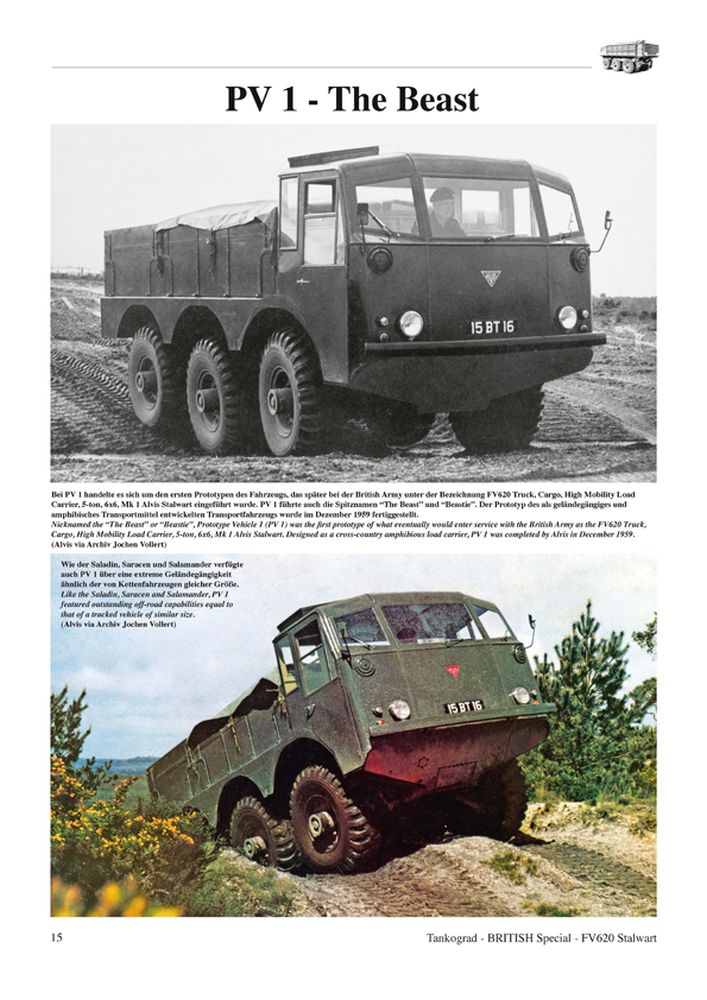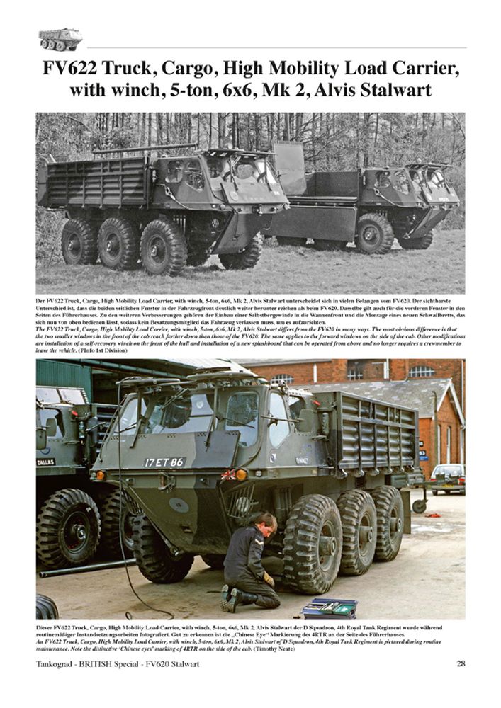 Tankograd präsentiert uns in seiner Reihe British Special wieder mal ein ungewöhnliches, britisches Fahrzeug mit Ecken und Kanten in Form des Amphibien-Lkws Alvis Stalwart. Der erste Textteil informiert uns über die Hintergründe der Firma Alvis, die FV600 Serie und die Entwicklungsstufen des amphibischen Lkws von den Prototypen bis zum Serienfahrzeug. Wir erfahren von Modifikationen, Sonderausstattungen und dem Interesse anderer Länder. Der 2. Textteil, unterstützt von anschaulichen Grafiken, erklärt die Technik des Stalwart inkl. Seiner Spezialitäten wie dem Wasserantrieb. Der Bildteil teilt sich wie folgt auf: · FV600 Series Tankograd hat sehr viele, interessante Fotos des Stalwarts in allen Variationen zusammengefasst. Von den Prototypen, die noch gar nicht die endgültige Form des Stalwarts erkennen ließen, über die Serienversionen als „einfacher“ Amphibien-Lkw bis hin zu den speziellen Versionen als Munitionstransporter oder als Berge/Instandsetzungsfahrzeug ist alles dabei. Auch interessant ist es zu erfahren, dass auch die Bundeswehr Fahrzeuge angeschafft hatte, wenn auch nur zu Erprobungszwecken. Meist kommt der Stalwart in Grün oder Schwarz/Grün daher, aber Tankograd bietet auch 2 Fotos einer Versuchs-3-Farbtarnung. Alle Fotos sind mit ausführlichen Bildbeschreibungen versehen, gestochen scharf und lassen jedes Detail erkennen. Wer sich auf den Bau eines Stalwart-Modelles vorbereitet, wird sicherlich viel Freude an diesem Heft haben, aber auch technisch Interessierte kommen voll auf ihre Kosten Der Preis beträgt in Deutschland EUR 14,95 (zzgl. Versandkosten) direkt ab Verlag.Autor: Carl Schulze