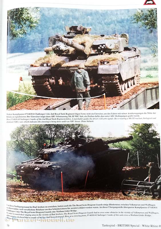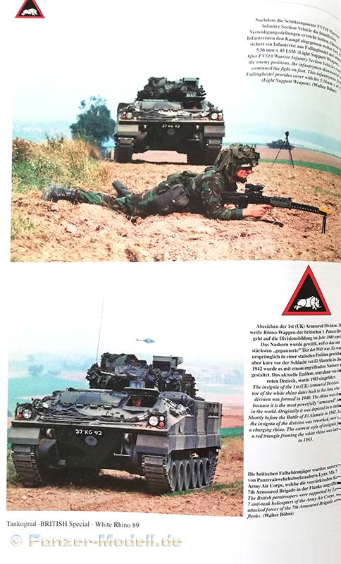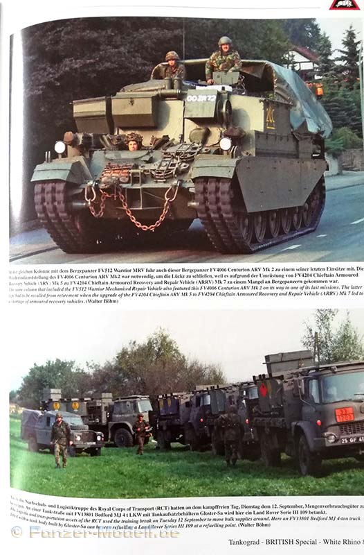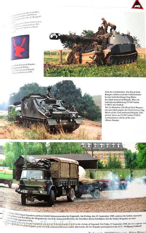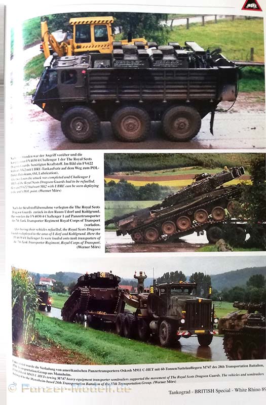 Nach dem Textteil kommt der Bildteil in 124 Farbfotos (auch dieser ist in die unterschiedlichen Übungen eingeteilt) wird die Übung White Rhino 89 sehr schön abgebildet. Hier findet sich alles was den Manöverbegeisterten Fan der britischen Armee das Herz höher schlagen lässt: Challenger 1 Panzer, Chieftain Panzer, Warrior MCVc, FV432 APSc, Chieftain ARRV, Centuron ARV, Scimitar, Spartan, Tracked Rapier, M109A2, Bedford MJ, Scammel Commander, Land Rover, Ferret, Stalwart etc…..Auch Bilder von luftgelandeter Infanterie mit Gazelle und Puma Helikoptern sind zu finden und ein Bild eines amerikanischen C-HET M911 auf den ein Challenger Kampfpanzer verladen wird.