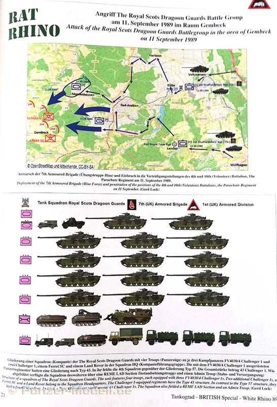 Anschließend wird im Detail über den Verlauf der Übung White Rhino 89 berichtet inklusive der Aufmarsch- und Vorbereitungsphase, der Teilübungen Rat Rhino und Stag Rhino und der Rückmarschphase. Aussagekräftige Karten ergänzen hier den Text.