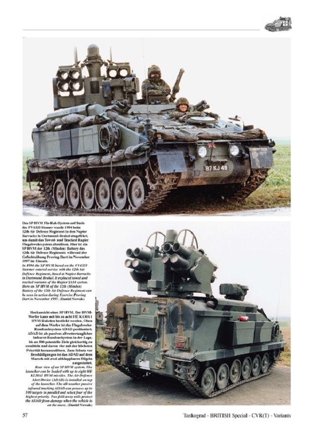 Dieser zweite Band bietet einen interessanten Abriss über die unterschiedlichen Varianten der Familie der gepanzerten Aufklärungsfahrzeuge (CVR(T) Combat Vehicle Reconnaissance Tracked) der britischen Streitkräfte.. Es folgt eine Fahrzeugbeschreibung des FV102 Striker CVR(T) Raketenjagdpanzers. Danach folgt ein Teil über den FV103 Spartan CVR(T) Mannschaffsttransportwagens, auch hier kann der Bildteil voll überzeugen und führt über Spezialfahrzeuge wie den Spartan mit Milan Compact Turret bis zu den neuesten Versionen mit Dieselmotoren bis in die Gegenwart. Der nun folgende Teil beschäftigt sich mit dem FV104 CVR(T) Samaritan Sanitätspanzer mit erhöhtem Aufbau vom ersten Einsatz bis zu den neuesten Versionen mit Zusatzpanzerungselementen. Genauso ist es im nächsten Teil über das FV105 CVR(T) Sultan Gefechtsstandfahrzeug. Auch beim nächsten Teil über den FV106 CVR(T) Samson verhält es sich so. Im vorletzten Abschnitt geht es um die Weiterentwicklung FV4333 Stormer, welcher nur in geringen Stückzahlen zum Einsatz kommt und Shielder VLMLS, welcher nur eine kurze Einsatzzeit von ca. 15 Jahren als Minenwerfer hatte. Am Ende dieses Heftes finden wir einen Blick in die Zukunft dieser außergewöhnlichen Fahrzeuge, die seit nunmehr fast 50 Jahren ihren Dienst versehen und ihrer designierten Nachfolger.