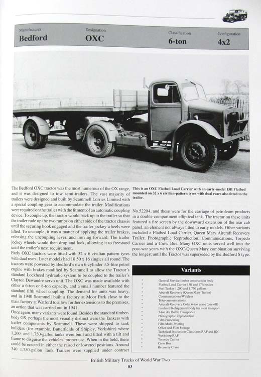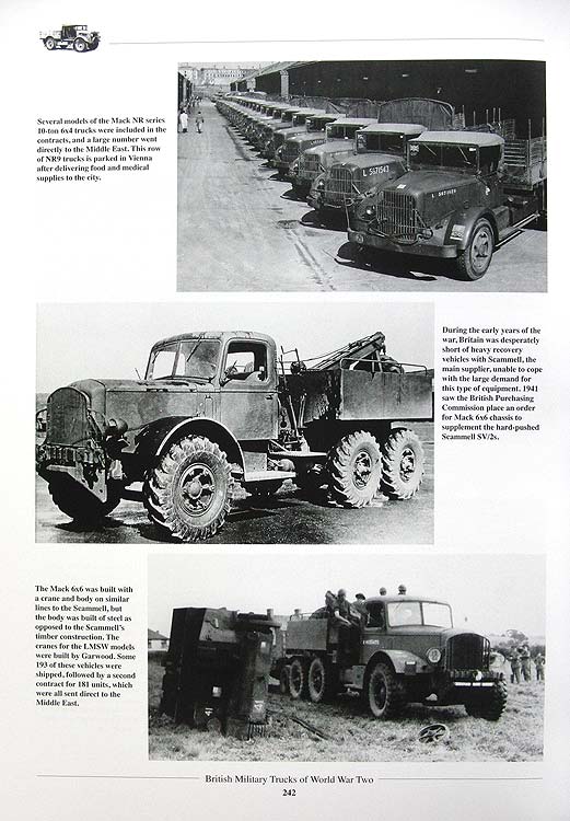 Jeden einzelnen LKW hier aufzulisten würde den Rahmen sprengen, aber die LKW Hersteller, die hier behandelt werden, sind - AEC - Albion - Austin - Bedford - Commer - Crossley - Dennis - Dodge UK - ERF - Foden - Ford - FWD - Garner - Guy - Hillman - Humber - Karrier - Leyland - Maudsley - Morris - Scammell - Standard und Thornycroft. Danach folgen einzelne Kapitel zu den Lend-Lease LKW, sowie einige Seiten mit den LKW aus kanadischer Produktion und zuguterletzt 3 Seiten mit den wichtigsten verwendeten Anhängern.