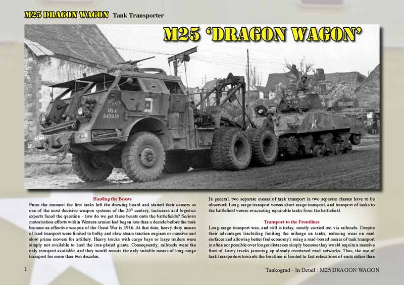Das amerikanische Ungetüm von Panzertransporter, der Dragon Wagon wird in dieser Publikation in Wort und Bild vorgestellt. Wer aber nun vornehmlich Fotos vom Original aus der Zeit des WK II erwartet wird leider enttäuscht. Da es sich bei diesem Buch um ein „In Detail“ handelt werden lediglich in der Einleitung Bilder aus längst vergangenen Zeiten präsentiert. Das Walkaround wird an einem restaurierten Fahrzeug in sehr gutem Zustand vorgenommen. Und da scheint es nicht eine einzige Schraube zu geben die nicht auf den Fotos enthalten ist.