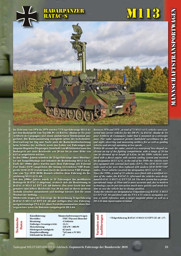 Zu jedem Fahrzeug gibt es mindestens eine ganze Seite mit Fotos und Basisinformationen. Dies ist textlich in deutsch und englisch mit der Entwicklung, Update und Einsatzgeschichte und einer Infobox mit grundlegenden Daten zu Hersteller, Motorisierung, gewicht, besatzung, Motorleistung, Bewaffnung und Stückzahl sowie eine Aufschlüsselung der verschiedenen Ausführungen und Varianten und deren Stückzahlen.